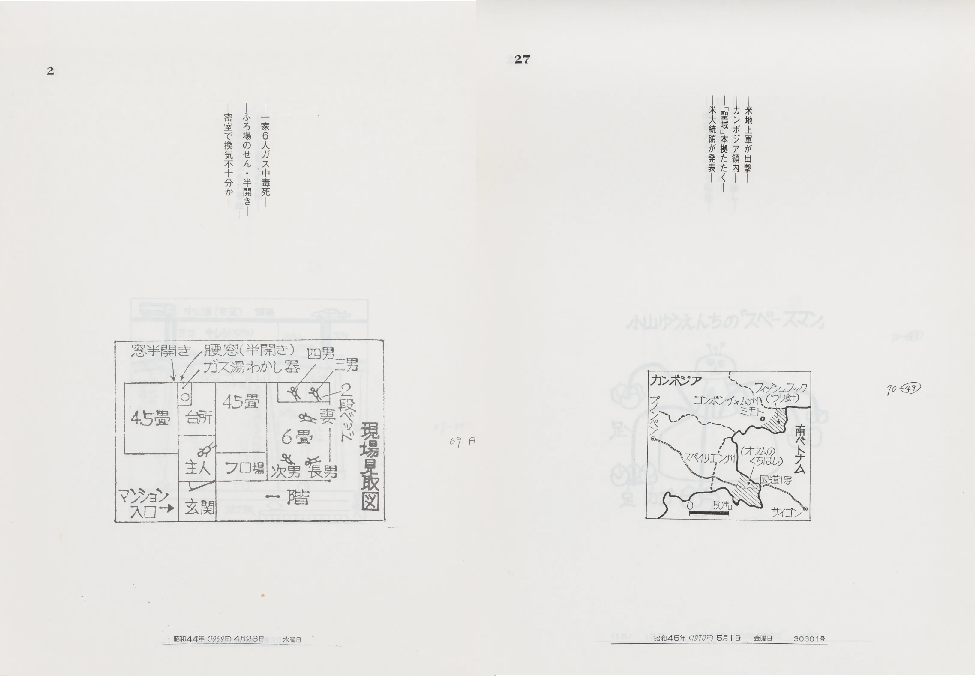 《事故現場見取図集》(1970)と名づけられたそのシリーズは、500部ほど刷られたようで、上部がホチキスで留められ、めくりながら閲覧されることが意図されている。《事故現場見取図集》は神田の書店で「展示」され、展示終盤には書店利用者の手垢でかなり黒ずんでいたとのことである。《事故現場見取図集》には、いわゆる殺人事件の現場見取り図や地図にとどまらず、凶器や装置の図解など様々な「図」が記録されている。それらは手書き特有の筆圧を残した線で構成されており、CGの図解が当たり前となった現在では尚更、客観的とも主観的とも言えない不思議な立ち位置を占めているように感じられる(当時は新聞社に「図」を描く専門の「職人」がいたのだろう、と海老原は振り返る)。ガス漏れ事件からベトナム戦争まで、「図」を伴って報道されている事件たちが等しく引用されている。