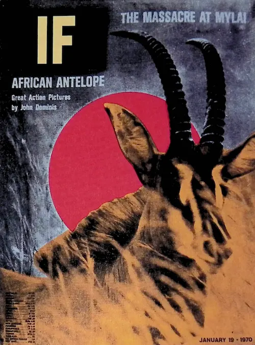 1970年1月19日(*24)、島は、ソンミ村の虐殺についての特集が組まれた──しかし表紙にはそのことは載っていない──『LIFE』誌(1969年12月5日号)を美術の技術体系を用いて「投げ返した」。「LIFE」のロゴを黒に変え、LとEを消去し「IF」としたうえで、日の丸のような赤い円を追加、右上の「AFRICAN ANTELOPE」(表紙に掲載されている動物のこと)の文字列を左側に移行する。こうしてできた余白に「THE MASSACRE AT MYLAI」(ソンミ村の虐殺)の文字列が書き込まれている。あたかも元からそうであったかのようなレイアウト変更である。だが、見ようによっては取るに足らないイメージの変更、擬態、潜伏が、核心部分の地層を剥き出しのまま保存することがある。その観点からもう一度、海老原暎の制作に話を戻す。
