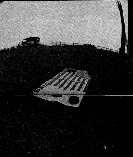 この作品はもともと出品予定だったものではなく、5月4日に発生したアメリカのケント州立大学での警察による学生への銃撃事件に対しての抗議の意志の表明のために、急遽追加発表されたものだ(実際にはアンドレに依頼された写真家・安齊重男が報道写真を複写し、模造紙にテキストを書いている(*20))。4月30日にニクソン大統領がベトナム戦争の一環としてカンボジア侵攻をテレビで宣言して以降──海老原暎が《事故現場見取図集》に収録した1970年5月1日の「地図」はその事件の報道である──、ケント州立大学では多くの学生たちがプロテストを画策していた。抗議運動の盛り上がりのなか、警察によって実弾が発射され、デモを傍観していた学生を含む4人が死亡し、9人が負傷する。「豚はその子供を喰べてしまうだろう。」と書かれた紙の右に設置された写真は、ジョン・ファイロが撮影したもので、彼はこの写真でピューリッツァー賞を受賞している。