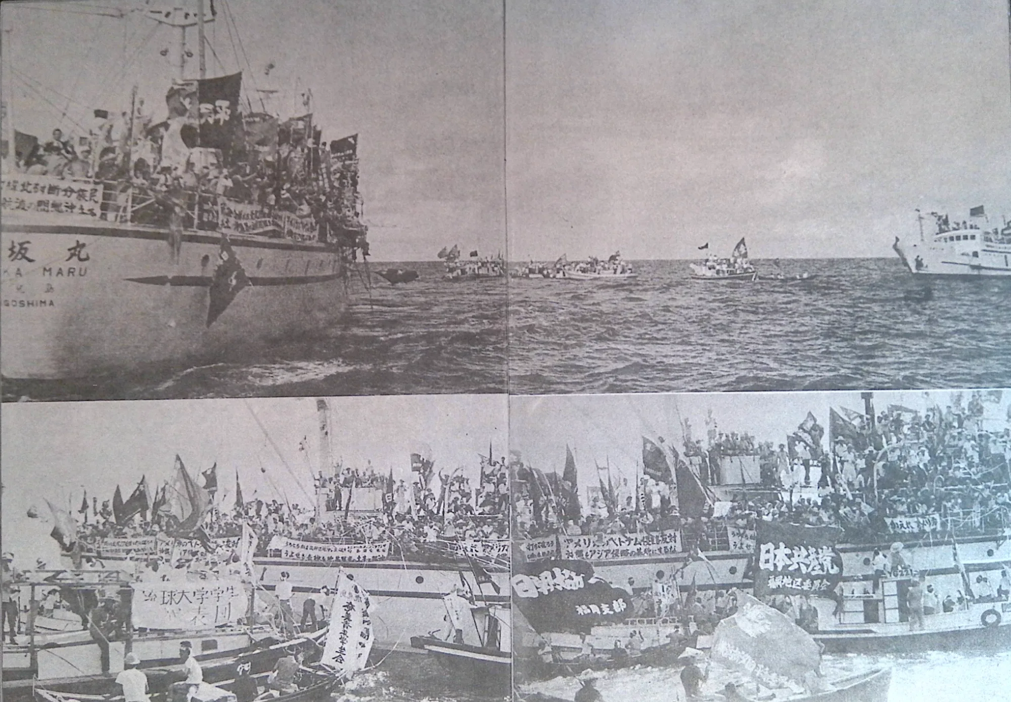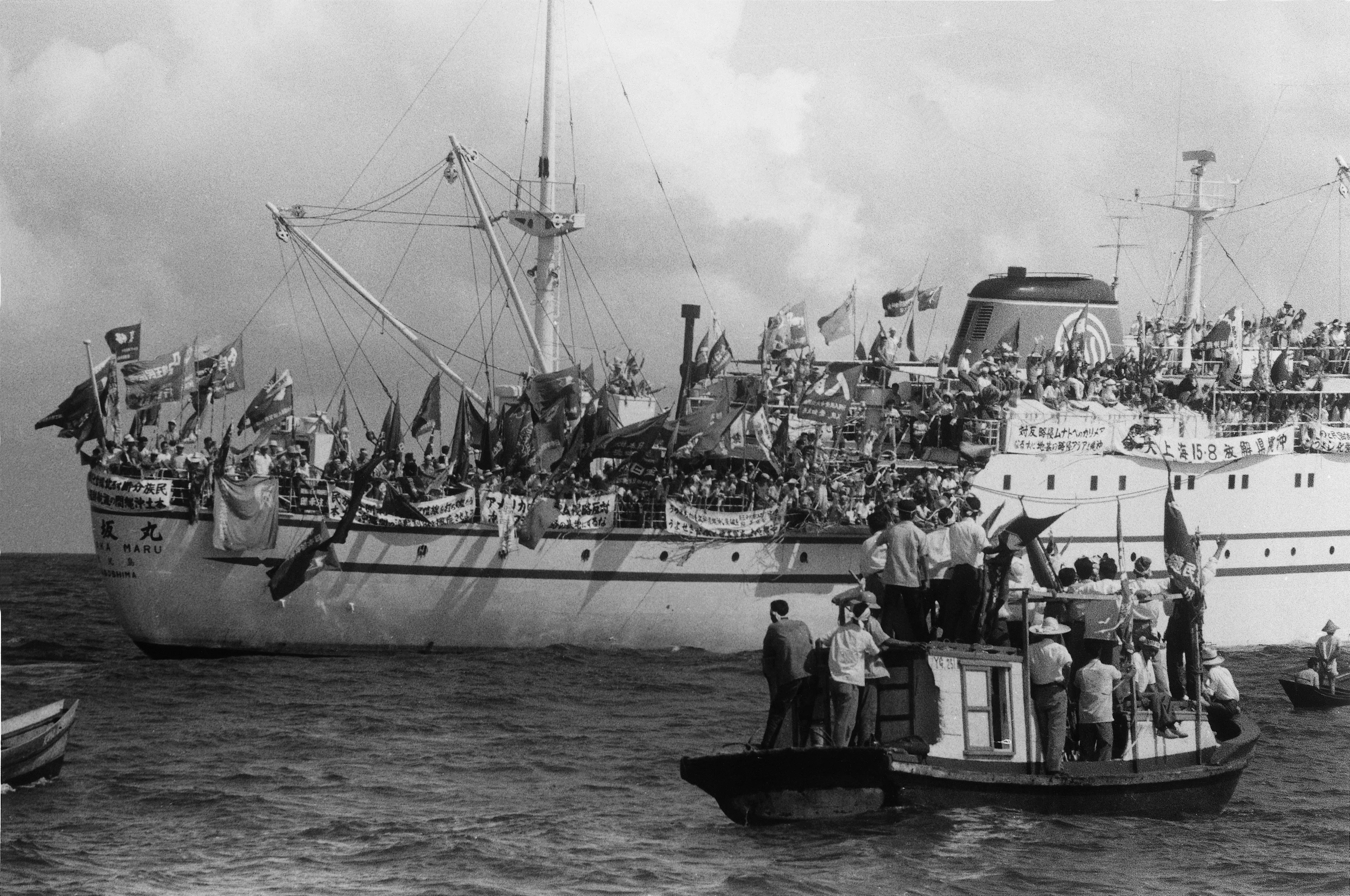 嬉野が撮影した船には、「アメリカのベトナム侵略反対/沖縄をアジア侵略の基地にするな」と書かれた横断幕がある。「海上大会」の2週間ほど前にトンキン湾事件が起きたばかりのタイミングであるが、沖縄はそのはるか前からアメリカ軍によってベトナム戦争のために使用されてきた。