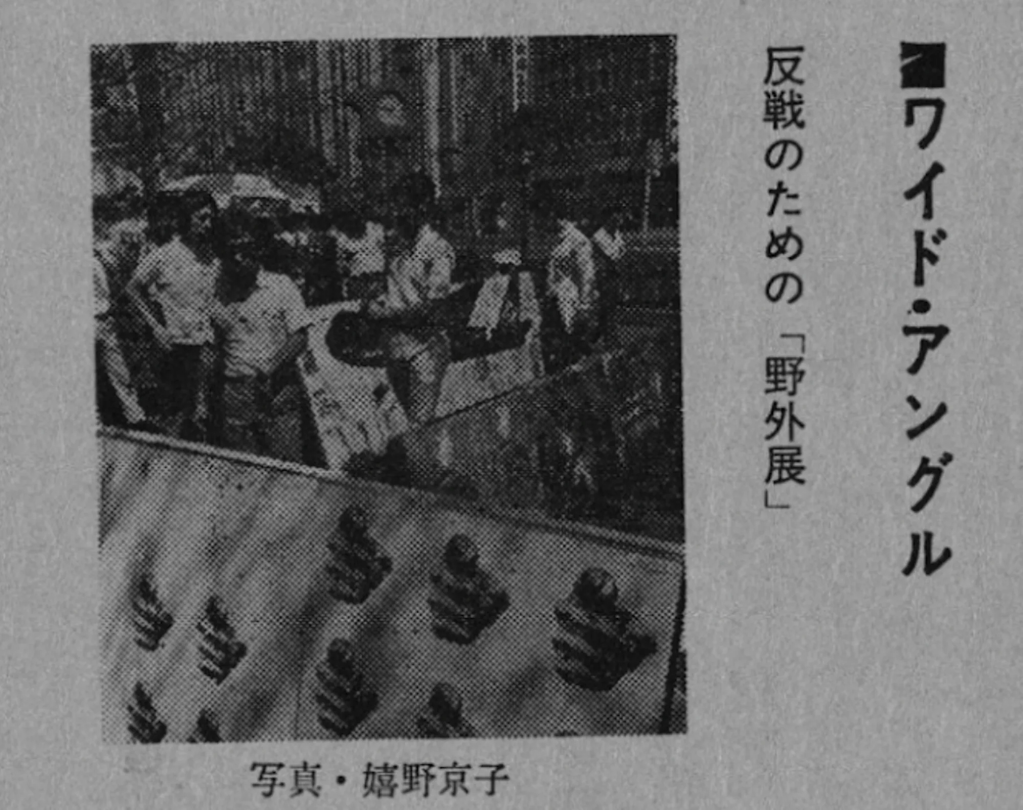 嬉野京子が撮影した写真が『美術手帖』に載っている(*35)。1970年9月号。小さなカットだが、よく見ると屋外にパネルが並び、半袖の人々とともに陽射しを受けている。7月26日の銀座数寄屋橋公園。田島征三(1940〜)をはじめとする絵本作家、イラストレーターたちで構成された「ベトナムの子供を支援する会」による、20回目の「反戦野外展」であった。
