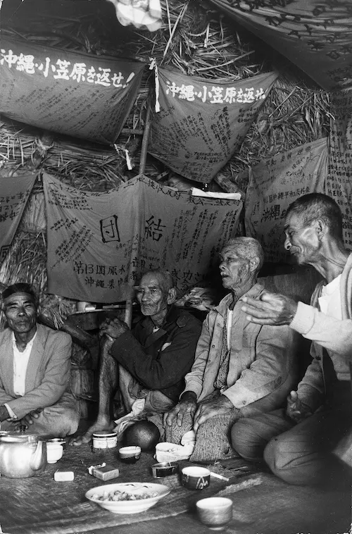洋上に大小の船が向かい合っており、それぞれに定員を超過した人々が乗り込んでいる。嬉野が撮影した、1964年8月15日「海上大会」の記録である。奥の大きな船は日本「本土」の人々であり、何艘かの小さな漁船に乗っているのは沖縄の人々だ。当時、この船の間には目に見えない「境界線」が引かれていた(*16)。「北緯27度」──1952年4月28日にサンフランシスコ平和条約によってアメリカの施政権下に置かれた「沖縄」は、この線を境として「日本」と互いに「外国」だったのである。