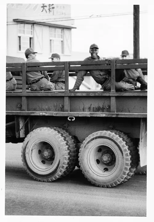 嬉野はこの状況を撮影したいと主張するが、行進団の面々は強硬に反対した。嬉野の身に危険が及んだり、行進団が弾圧を受ける可能性があるからだ。それでも引かない嬉野に、行進団の責任者のひとりが、自分の肩越しに隠れて撮影するよう言ってきた。撮影したフィルムを預けることと、1枚だけしか撮らないことを条件に、である(*20)。また、嬉野自身も後から気づいたそうだが、撮影のタイミングを見計らって行進団のひとりが米兵に話しかけていた。カメラから気を逸らすためだ。