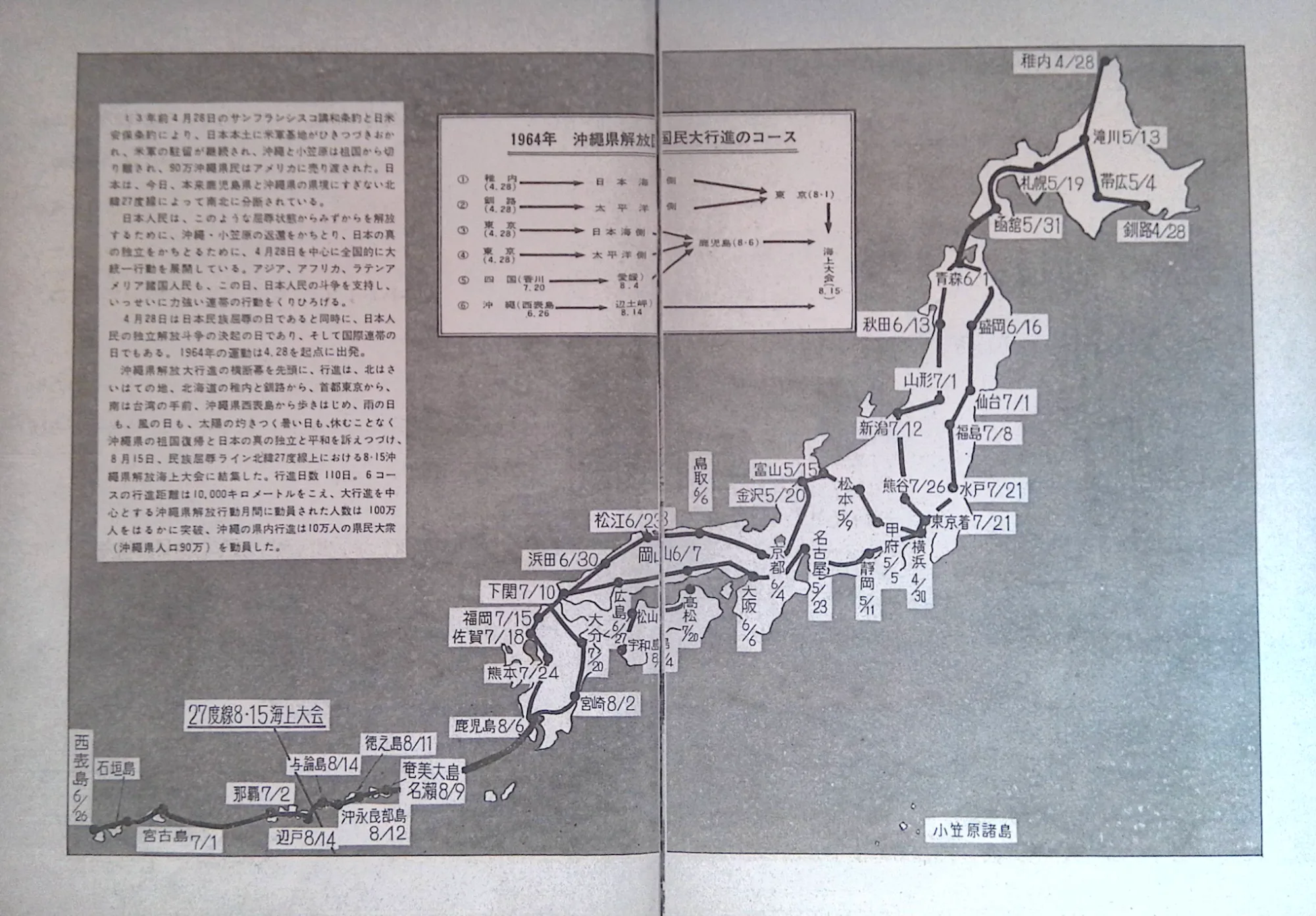 海の上で沖縄と本土の人々が出会い、その後、沖縄の解放を訴える行進団が、鹿児島から東京まで100日以上かけて歩いているという。東海道新幹線開通の1年前のことである。嬉野は焼津で行進団と合流し、最後の15日間、行動をともにした。