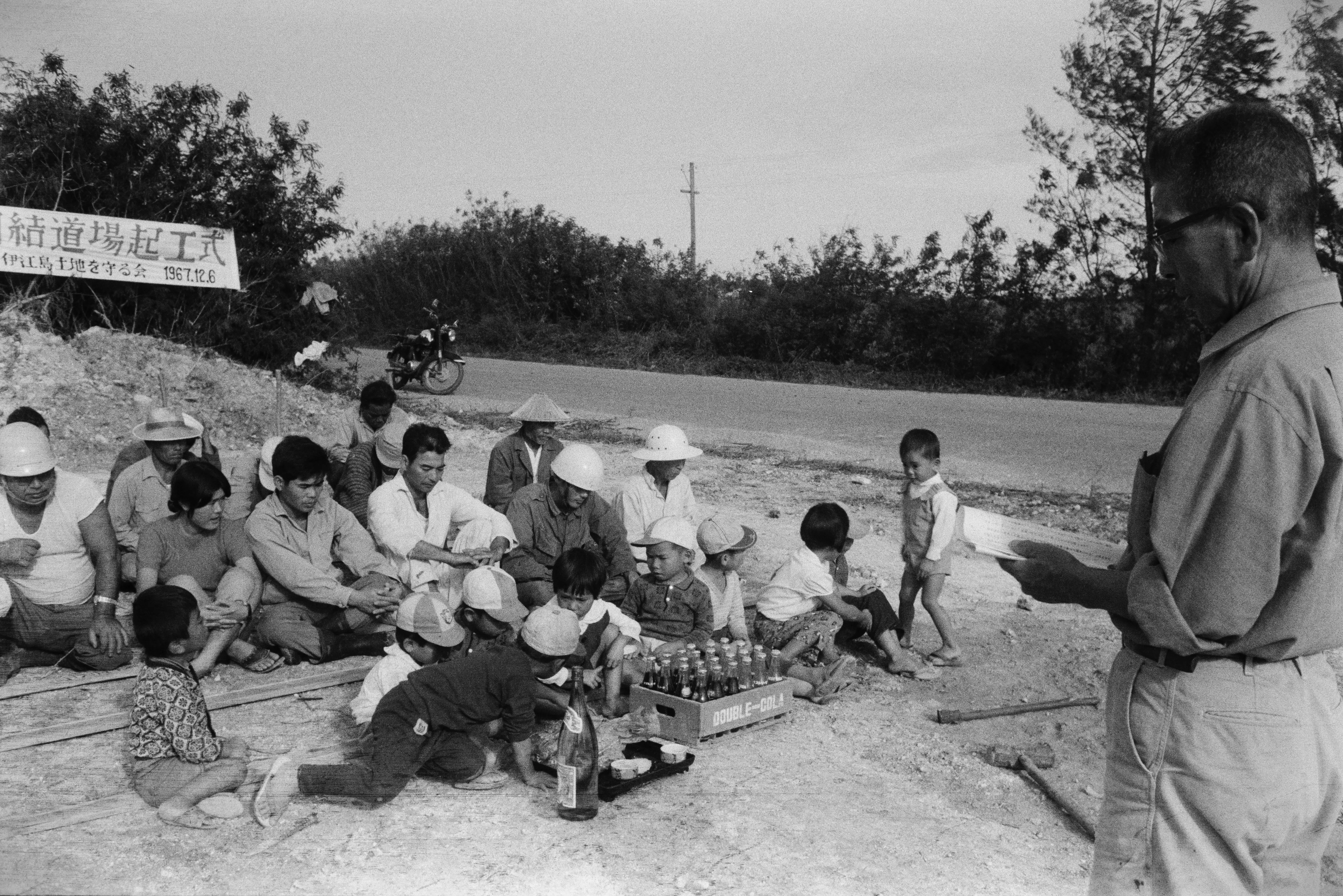 米軍による土地の強制接収と闘う沖縄・伊江島の島民。「団結道場」起工式の様子。 1967年(以下、断りのないものはすべて撮影:嬉野京子)嬉野蔵ネガよりデジタル化:山本渉