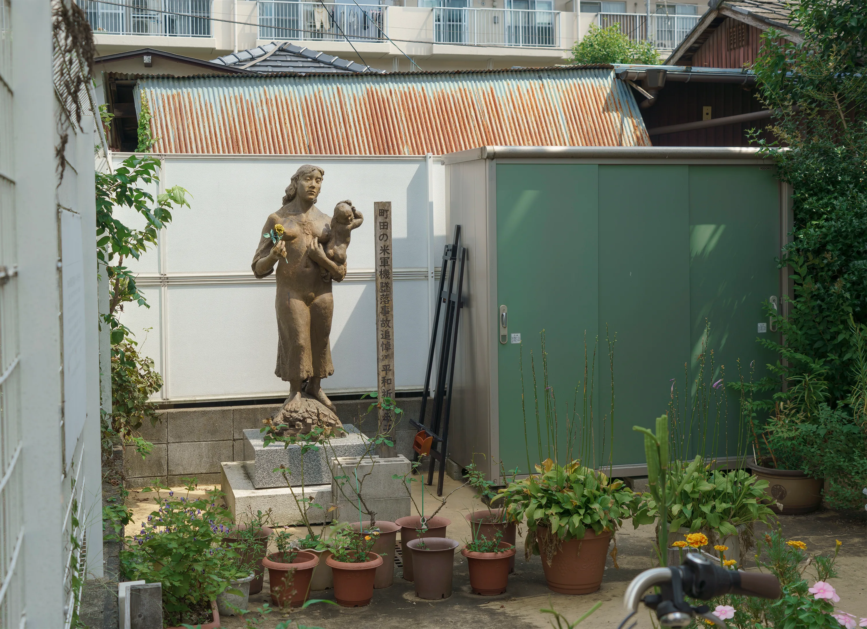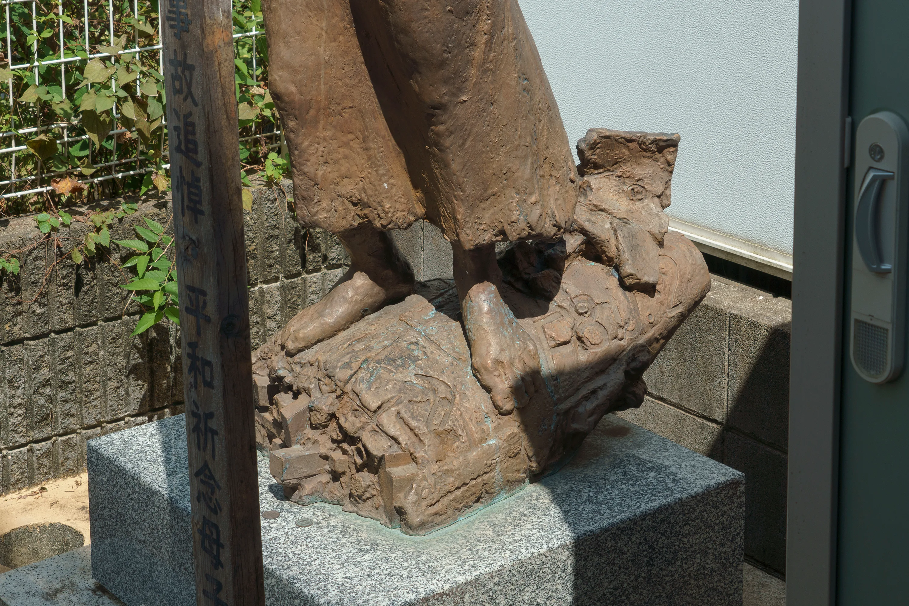 町田の米軍機墜落事故関係者たちは寄付を募り、地元で長く中学校教師を務めた彫刻家・日比野知三(1936〜)に平和像の制作を依頼している(*29)。2017年には町田市長に対して平和像の寄贈を申し入れたが拒絶され、現在に至るまで平和像は墜落現場近くのマンションの駐輪場に「仮置き」されたままである(*30)。