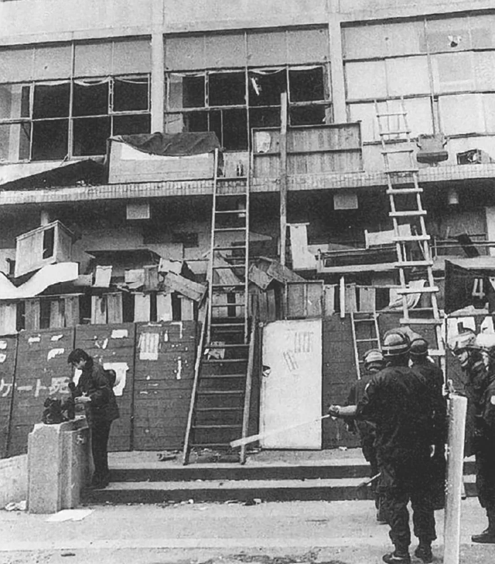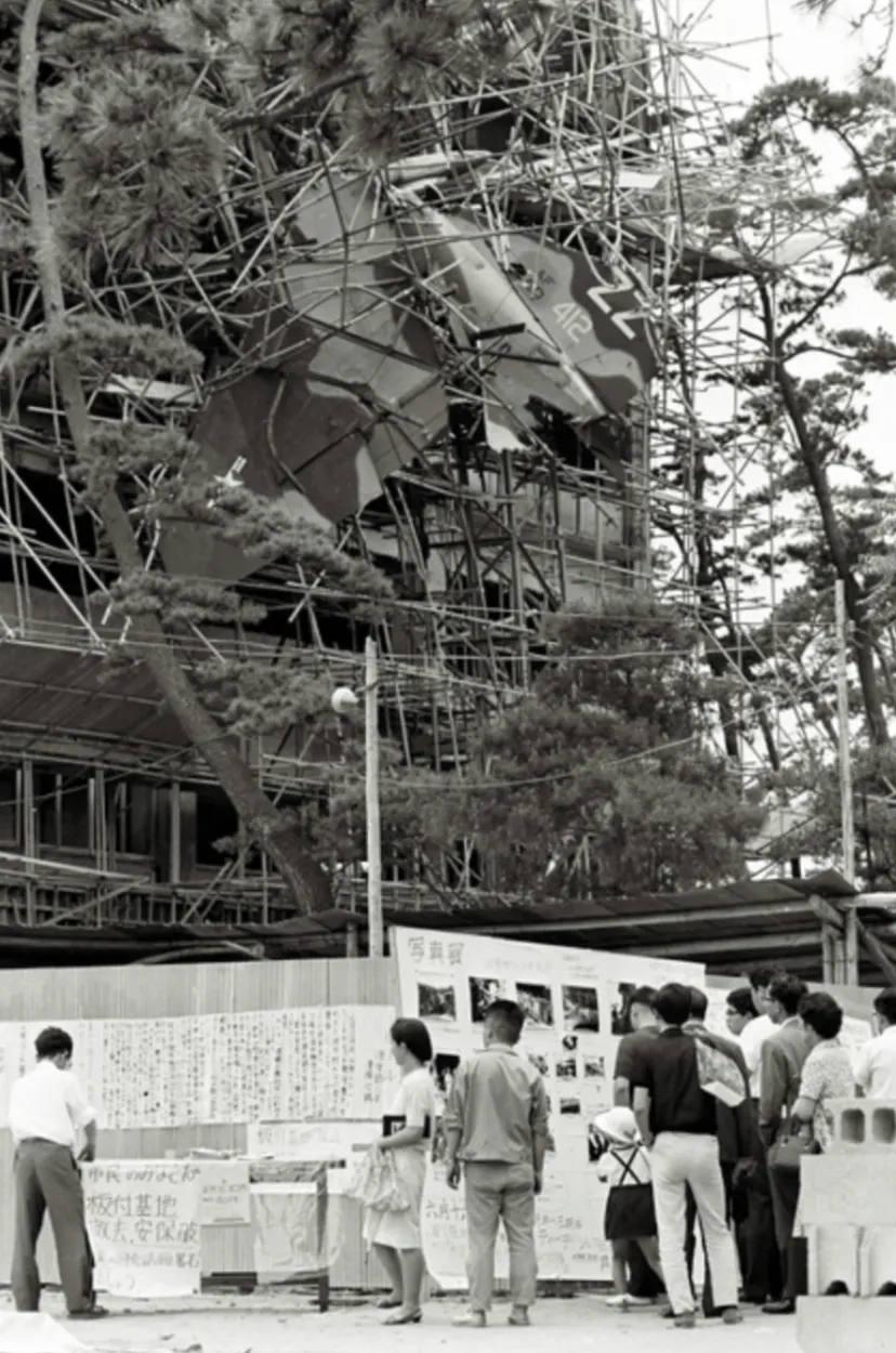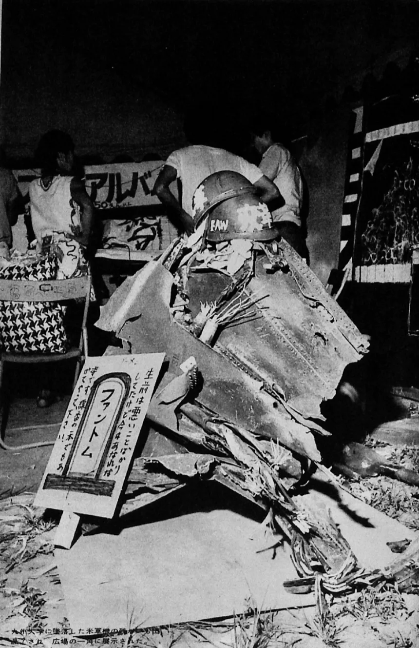 原口がバリケード封鎖された日藝キャンパスで《スカイホーク》を制作していた頃、九州大学箱崎キャンパスでは、ある米軍機の処遇をめぐる激論が繰り広げられていた。1968年6月2日、九州大学電算センターに墜落した米軍機ファントムは、パイロットも含め幸いにも死者がでなかったものの、墜落現場のそばにはコバルト60(放射性同位体)を保管する倉庫があり、放射能汚染の可能性さえあった。当時「大学のなかに戦闘機があった」のは日大だけではなかったのである。学生、教職員、地元住民たちは米軍への抗議の声をあげ、機体回収阻止を含む様々な闘争が繰り広げられてきたが、驚くべきことに、墜落機の一部は大阪まで運ばれ、「展示」されている。