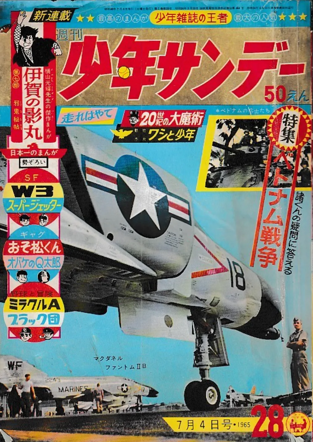 『週刊少年サンデー』には「特集 ベトナム戦争」が「おそ松くん」や「オバケのQ太郎」と並び、「ウルトラマンの戦争とヴェトナム戦争は、『少年マガジン』では完全に等価なものとして扱われていた」(*3)。そしてその表紙に大写しになっているのはキャラクターの顔ではなく、戦闘機であった。当時(に限らないが)、学校や家庭での「反戦」「非暴力」「友好」のイメージや言説、あるいは大人たちの「説き伏せ方」に不信感をもつ子供たちは少なくなかったであろうし、そのなかから、兵器の知識や情報を「教養」として提供してくれる媒体を求める読者たちが現れたことも想像に難くない(*4)。