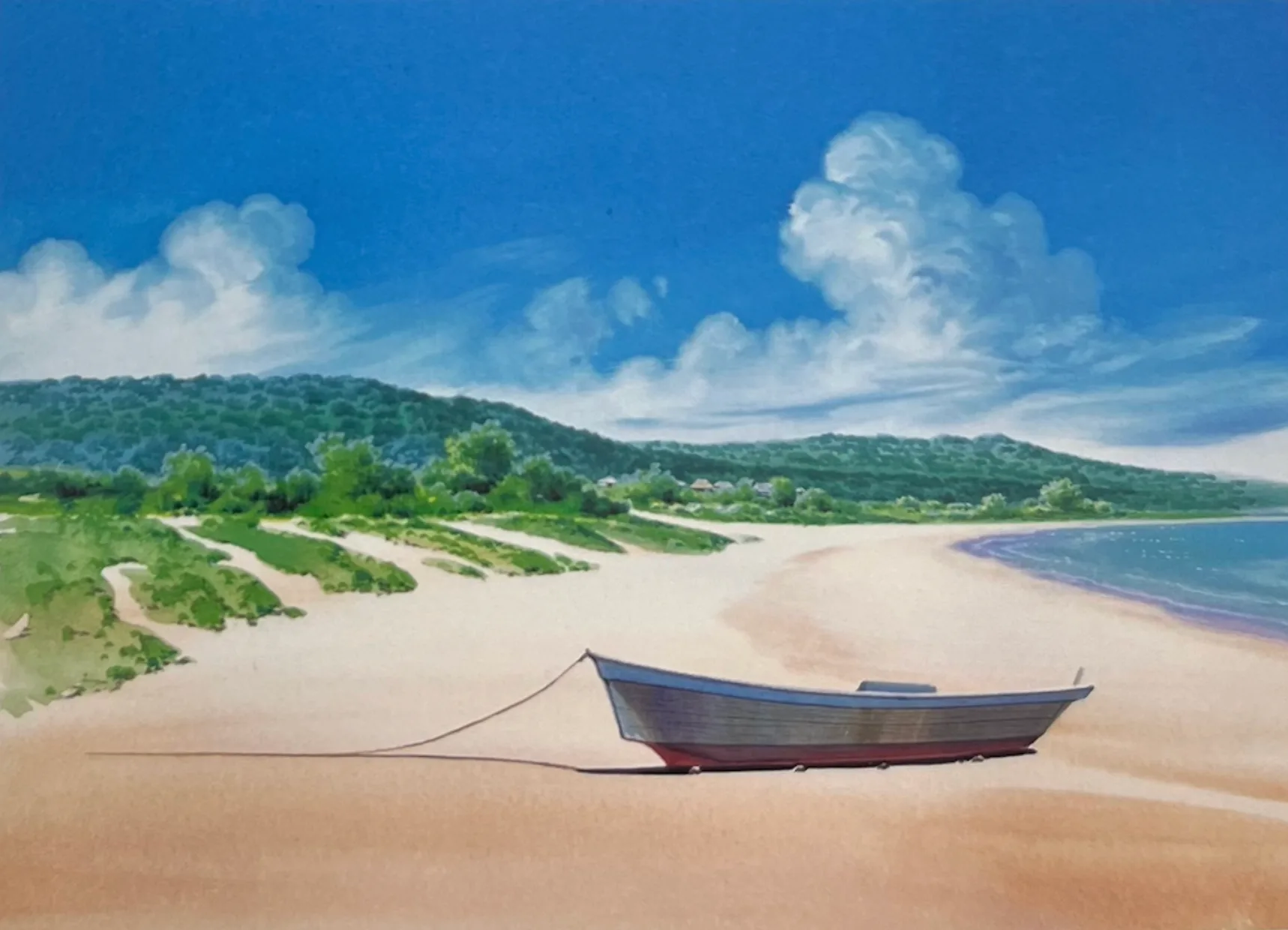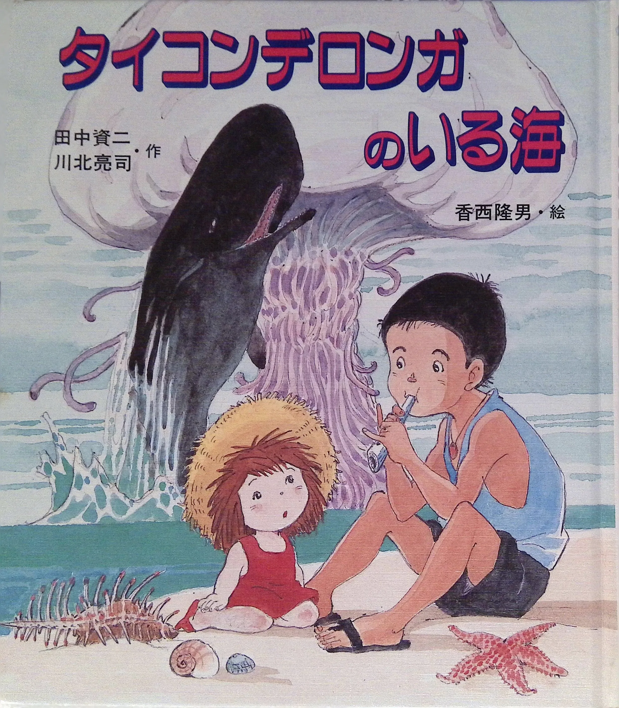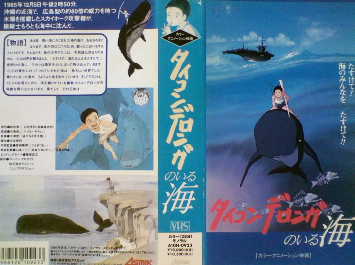 事件発覚後すぐさま、『タイコンデロンガのいる海』という名の絵本とオリジナルアニメーションが制作された(紛らわしいがこちらはタイコン「デロンガ」である)。絵本とアニメには若干の相違があり、アニメではエンドロールでこれまでに発生した核兵器事故の一覧が流される。冒頭では、悪天候の海上でタイコンデロガ号と思しき軍艦から一機の戦闘機が滑り落ちて海中に沈むシーンが挿入されている(*34)。アニメの背景美術を手掛けたのは山本二三(1953〜2023)であり、「二三雲」と呼ばれる彼の特徴的な雲はもとより、「沖縄の島と海」(*35)の描写も、米軍の水爆搭載戦闘機の水没事故とその海洋汚染の危険性を告発するために発揮されることとなった。