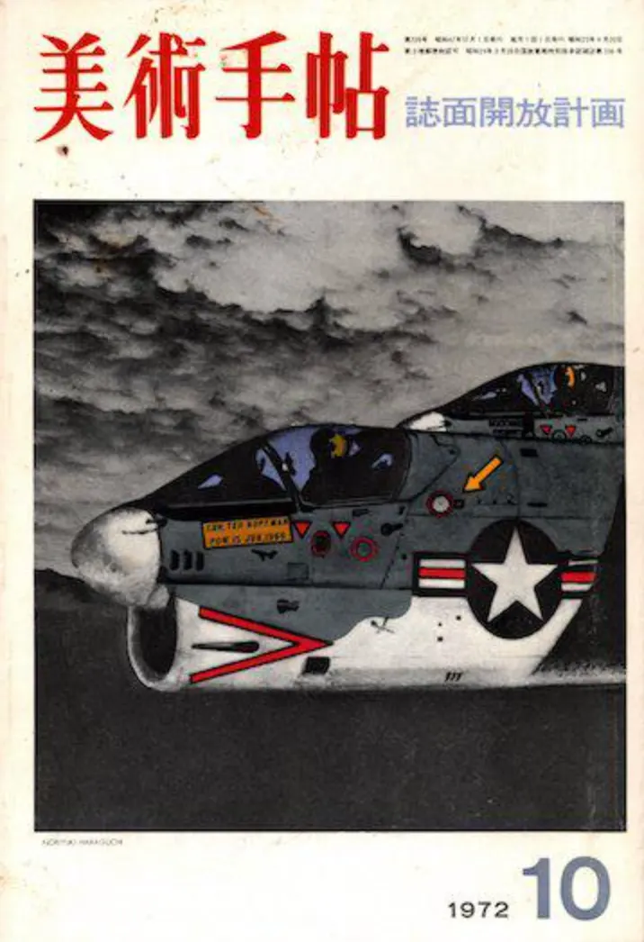 ベトナム戦争が直接的に反映された『美術手帖』の表紙といえば、1972年10月号であろう。「誌面開放計画」と題されて表紙を明け渡された原口典之(1946〜2020)は、『世界の傑作機』1972年5月号に掲載された写真をもとに、2機の戦闘機を描いている。A-7「コルセア II」──1967年からベトナム戦争に投入されたアメリカ軍の戦闘機である。