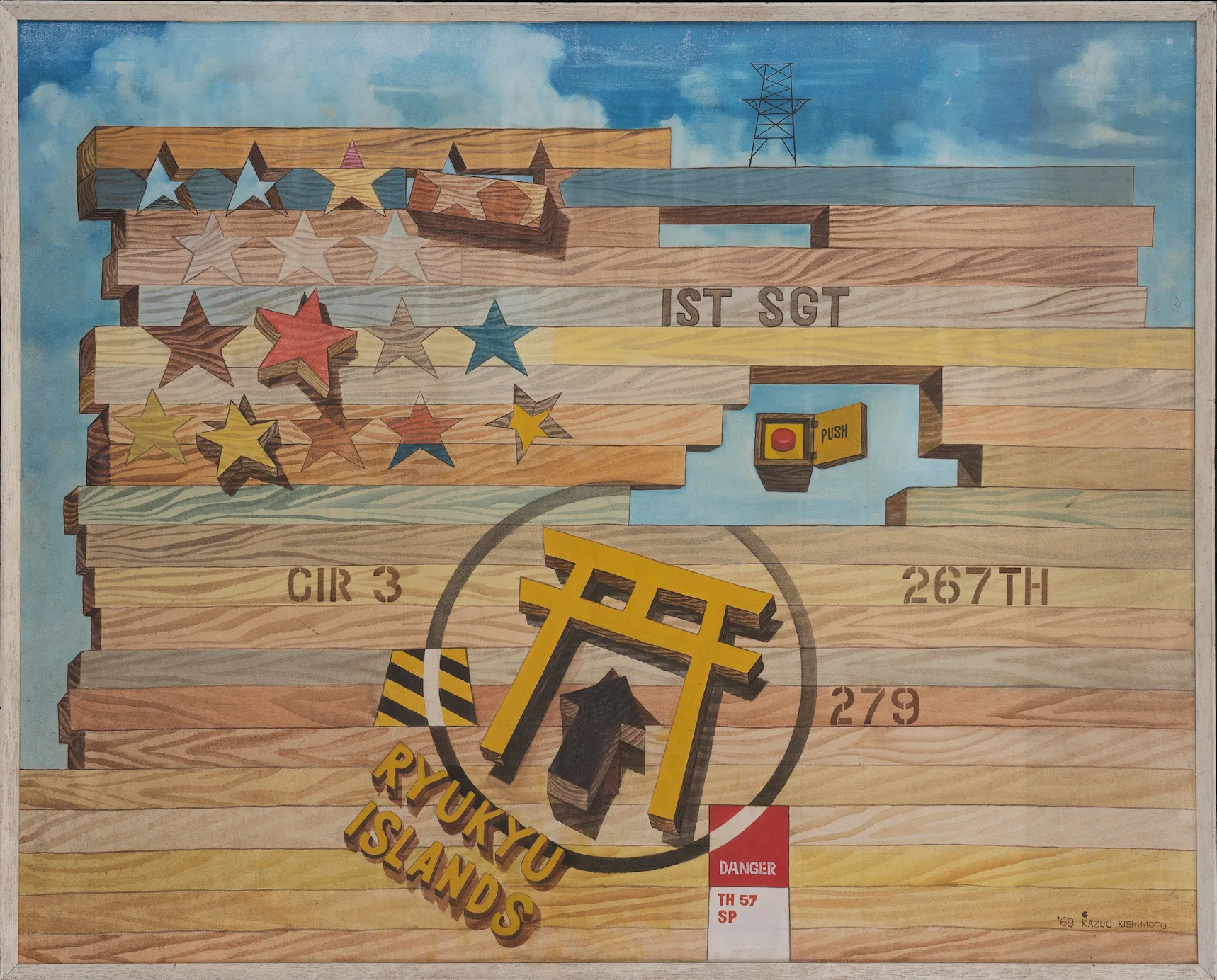 岸本は、1969年に《積み木のOKINAWA》と題された油彩画を手がけてもいる。星条旗と言ってしまってよいのか、星型と横長の木製ブロックで構成されていて、奥行きもなく、所々に隙間もあり、不安定な壁のようにも見える。背景は白い雲と青い空で晴れやかなのだが、積み木の上には鉄塔が建っていて、隙間からはまたも核のスイッチが顔を覗かせている。円で囲われた黄色い鳥居は、琉球米軍司令部 (ライカム)のマークだろうか。積み木の隙間を眺めていると、艦砲射撃の痕跡にも見えてくる──。