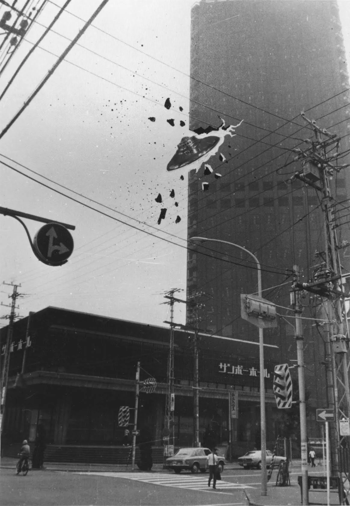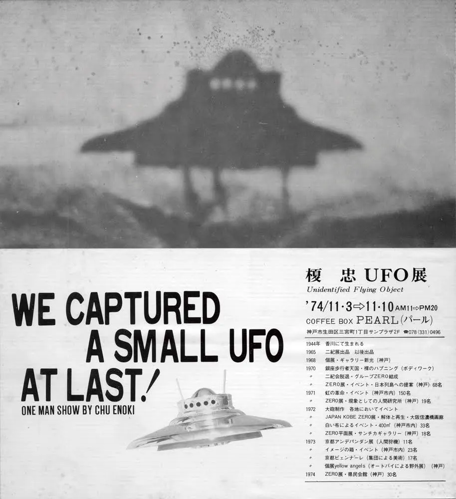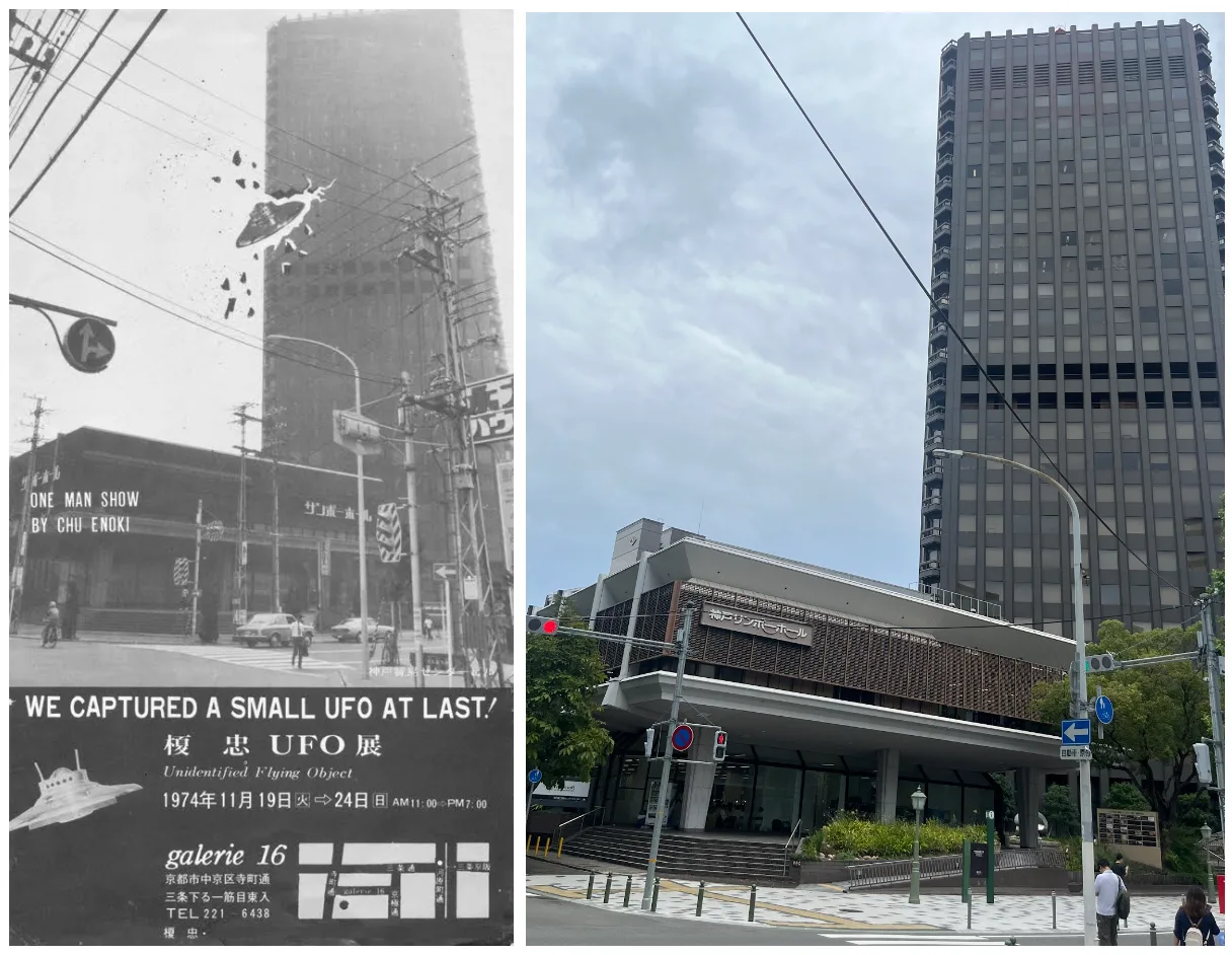 1974年、榎忠(1944〜)がとうとうUFOの捕獲に成功する。小型のUFOは、1970年に開館したばかりの兵庫県立近代美術館をはじめ、神戸のランドマークを次々に破壊して回っていた。神戸港近くにそびえる黒いビルもまた、UFOの侵攻目標となった。1969年に竣工した、当時西日本一の高さを誇る110mの「超高層ビル」──神戸商工貿易センタービルである。