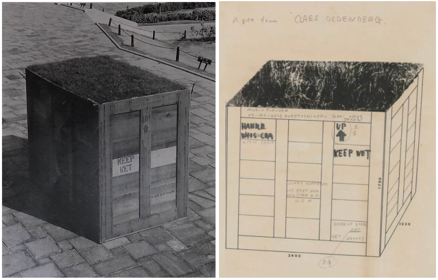輸送用の木箱の上部は、セントラルパークの地面が直送されていることを示唆するためか、芝生になっている。木箱には、オルデンバーグ(セントラルパーク)と福岡の大阪の住所に加え、「UP↑(こちらが天)」、「HANDLE WITH CARE(取扱注意)」、(「KEEP DRY」ならぬ)「KEEP WET(湿らせ続けること)」という表記が印字されており、輸送の手続きがユーモラスに擬態されている。