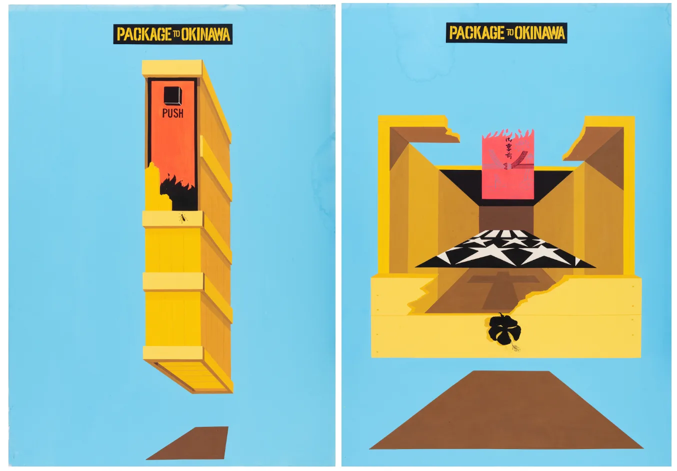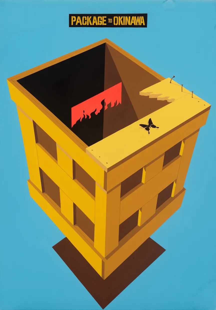 岸本一夫(1935〜)は「JAGDA(日本グラフィックデザイナー協会)」やオリオンビールのロゴマークの仕事で知られるが、1970年に「PACKAGE TO OKINAWA(沖縄行きの荷物)」と題した連作を手がけている(*35)。段ボール箱にとってかわられたはずのロジスティクス空間において、なおも木箱が登場し、(核?)ミサイルや爆発物のスイッチ、御霊前と書かれた香典袋、燃えるような赤い紙、モノクロの星条旗のようなものが収められている。