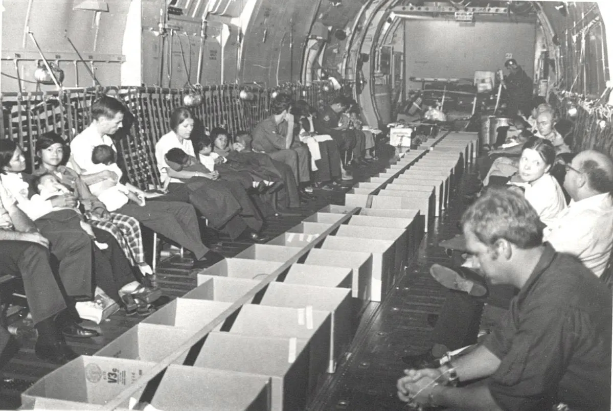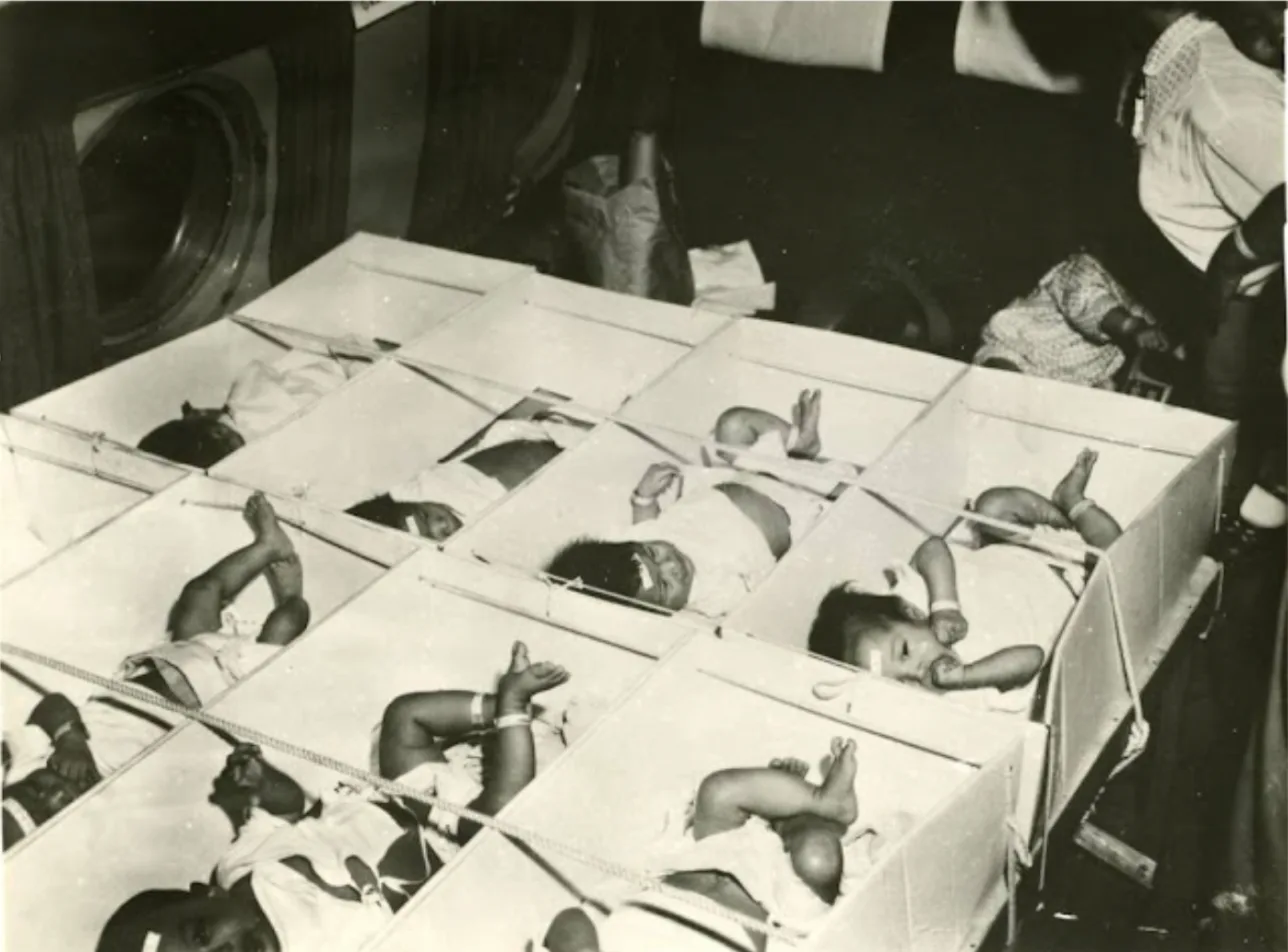 1975年4月2日、パンアメリカン航空のDC-8貨物機が陥落直前のサイゴンから横田基地へと向かっていた(*29)。貨物機には57人の孤児が乗っており、その多くは「段ボール箱」に入れられていたという。横田基地着陸後、23人の孤児は治療が必要と判断されて基地内の病院へ搬送された(*30)。燃料を補給した貨物機は数時間後に再び離陸し、アメリカ・オークランドへと向かう。その翌日、アメリカ大統領フォードは大々的にベトナムの孤児救出作戦を宣言する──作戦名「オペレーション・ベビーリフト(幼児空輸作戦)」。