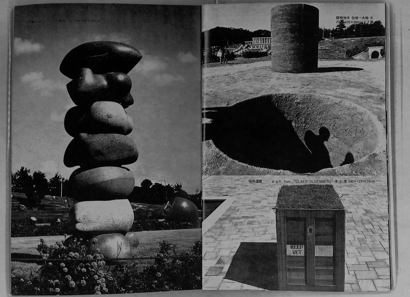 *8──『美術手帖』巻頭口絵解説として岡田隆彦(1939〜1997)が野外彫刻展のレビューを執筆している。事前に資料提供を受けていたのか、写真を見ながら神戸に向かったという岡田は、「遠慮なしにいって、写真で見たほうがいい作品が多かった。仰角で撮っているせいだろう、とくにスケールの点で、実物と写真はいちじるしく感じがちがうのである。写真に移し〔ママ〕かえられた像のほうが、実物よりずっと大きく見える。」(p.140)と書く。そしてさまざまな出品作に触れていきながらも、最後まで関根伸夫と福岡道雄には言及しない。