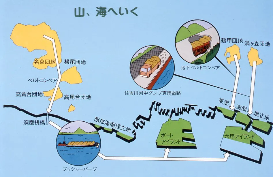 原口の仕事は多岐にわたるが、そのなかでも神戸の山岳を削り、ベルトコンベアで土砂を運搬し、世界最大の人工島・ポートアイランドを作り上げる計画はもっともよく知られたもののひとつだろう。「山、海へいく」と謳われた巨大土木事業である。着工は1966年(*3)、完成は15年後の1981年であり、原口がその完成を見ることはなかった。