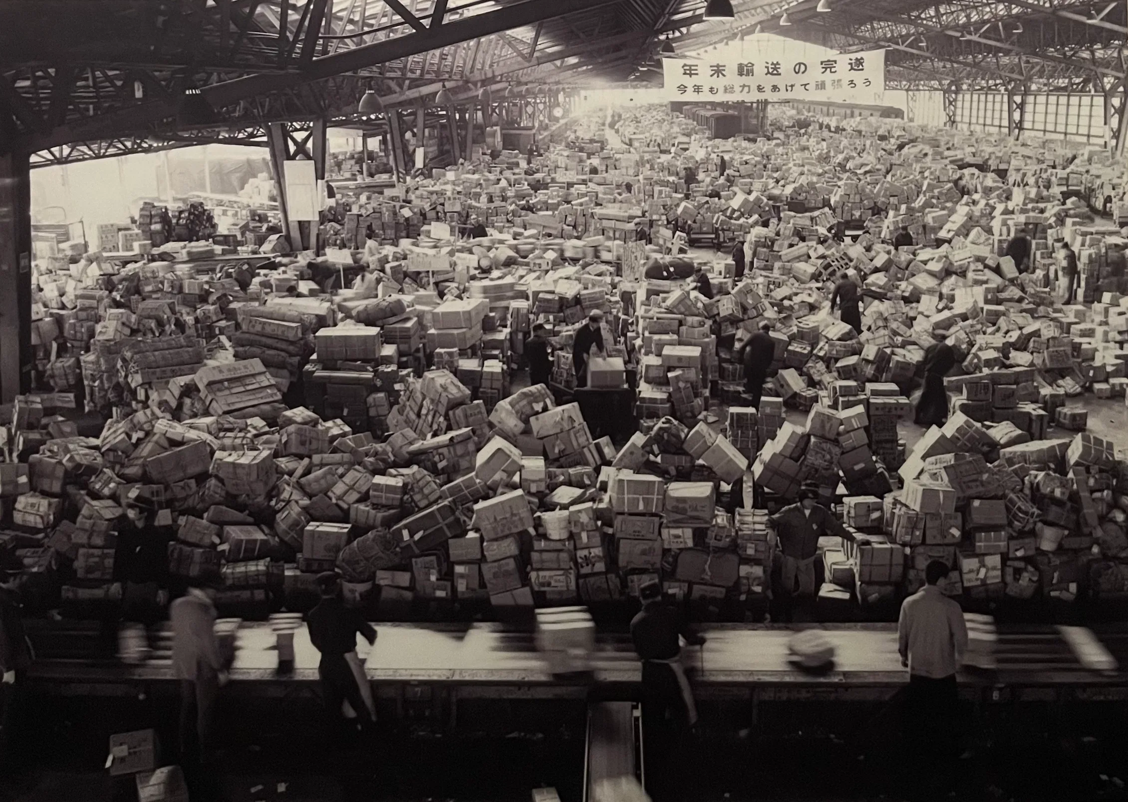 コンテナ化が急速に進むいっぽう、ロジスティクスの世界ではもうひとつの箱──段ボール箱が覇権を握っていた。日本においても、1951年に吉田茂内閣が「木箱から段ボール箱への切替」を閣議決定(!)して以降、段ボール箱は急速に浸透していった。木箱に比べて圧倒的に軽く、コストも安く済み、また(荷台の形から逆算して)規格を統一できる梱包が採用されないわけがなかった。1950年代末にはすでに段ボール箱の天下ではあったが、「イザナギと呼ばれた時代」には、全国の高速道路が整備され、トラックが24時間体制で走るようになり、また箱自体も耐水性や耐久性、印刷技術などが向上した結果、段ボール箱は物流において最重要の存在となっていた。