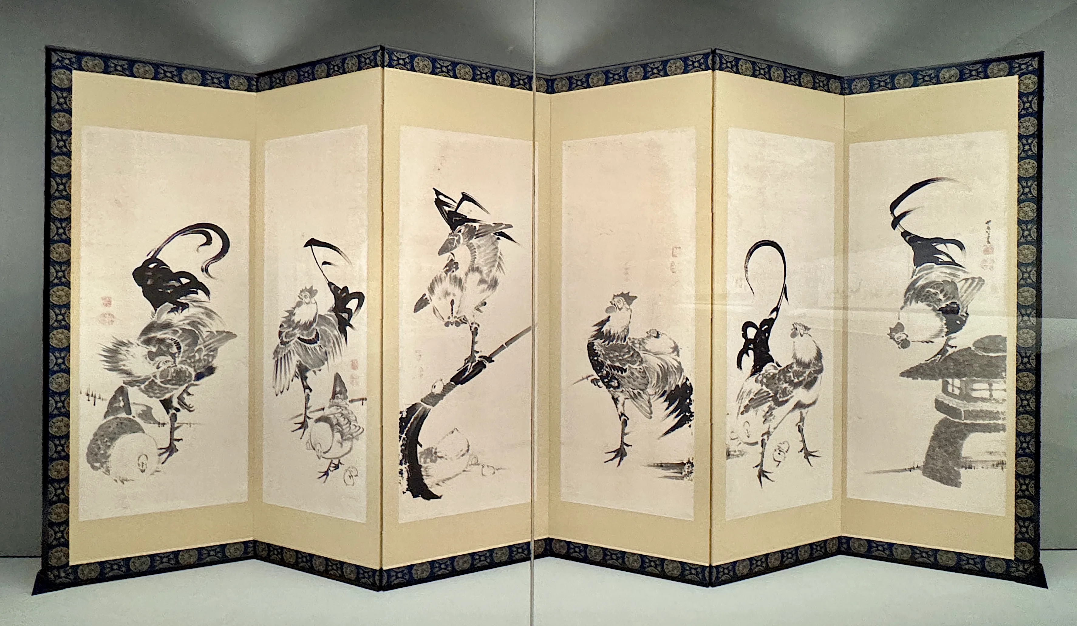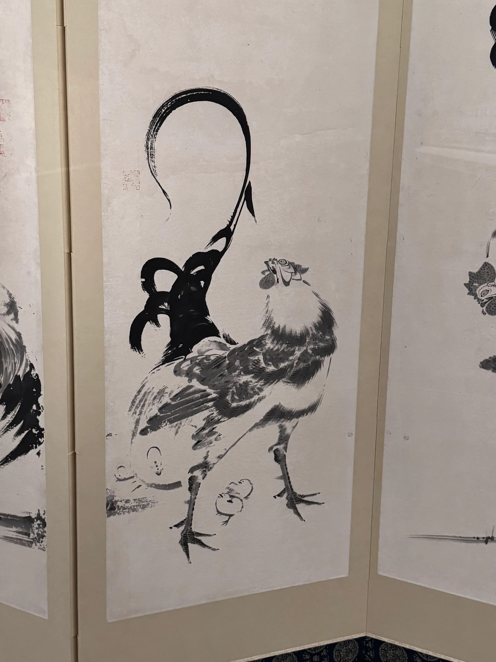 筆者が見たときは右隻が展示されており、その6つの面のそれぞれに、ポーズがまったく異なる鶏が描かれていた。《動植綵絵》のような彩色画では細密に描いているが、水墨で描いたこの屛風絵には、むしろ鶏というアクティブな動物が持つ激烈な勢いが感じられる。鶏の足元に目を向けると小さく2羽のひよこが描かれているのも、なかなか楽しい。