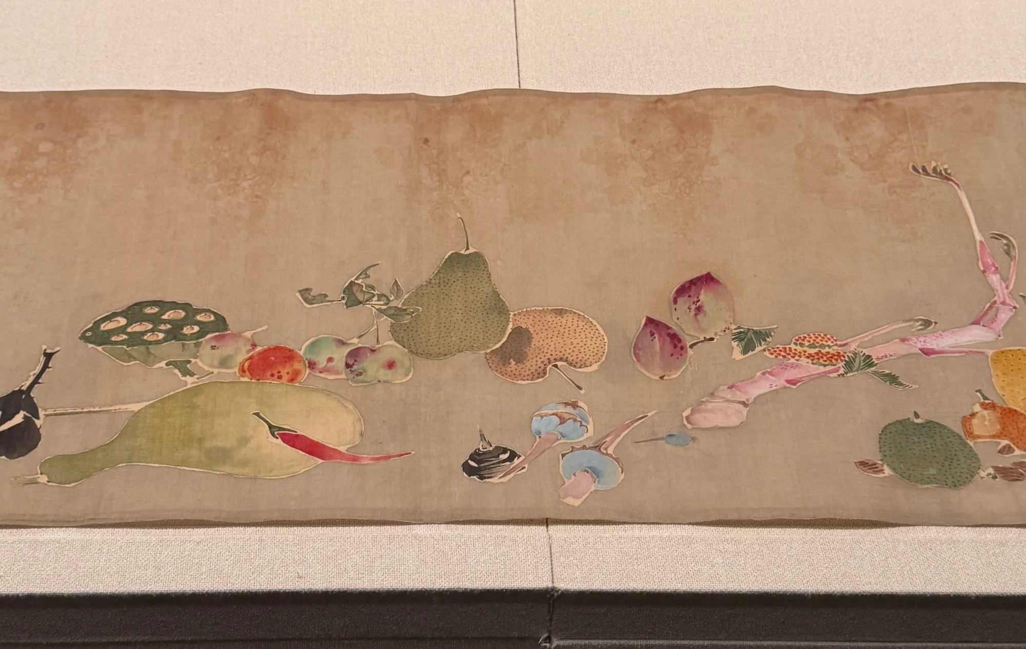 本展に出品された《果蔬図巻》における果蔬の描写は、じつに徹底している。並べて描かれた果蔬の種類はすべて異なり、計52種類。おそらくこれは現実の風景ではない。こう並べて写生すること自体がまず現実的ではない。彩りとしては、野菜が多いので緑系が大勢を占めるなかで、たとえば小さな唐辛子の赤がぴりりと画面を引き締めるなど、随所に配色の工夫がある。