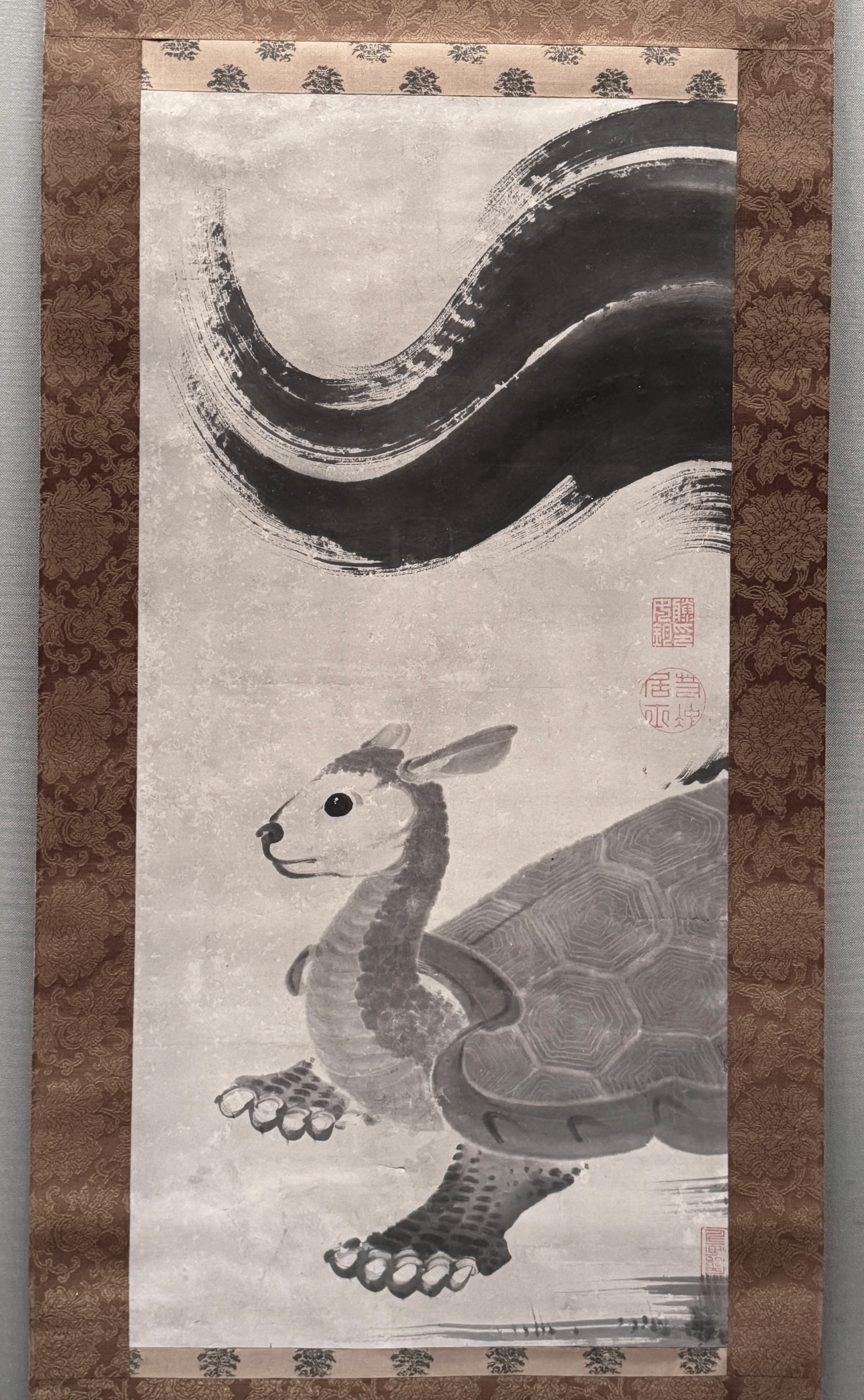 若冲は少々変わった動物も描いている。《霊亀図》と題されたこの絵に若冲が描いたのは、亀に似た霊獣だ。甲羅の模様を、紙の性質とにじみを利用して筋を出す「筋目描き」という若冲特有の技法で描いているのも興味深い。そして、尻尾の大ぶりなこと。画面から大きくはみ出している。それゆえ鑑賞者の頭の中で空間が大きく広がるのは、《馬図》にも通じる。