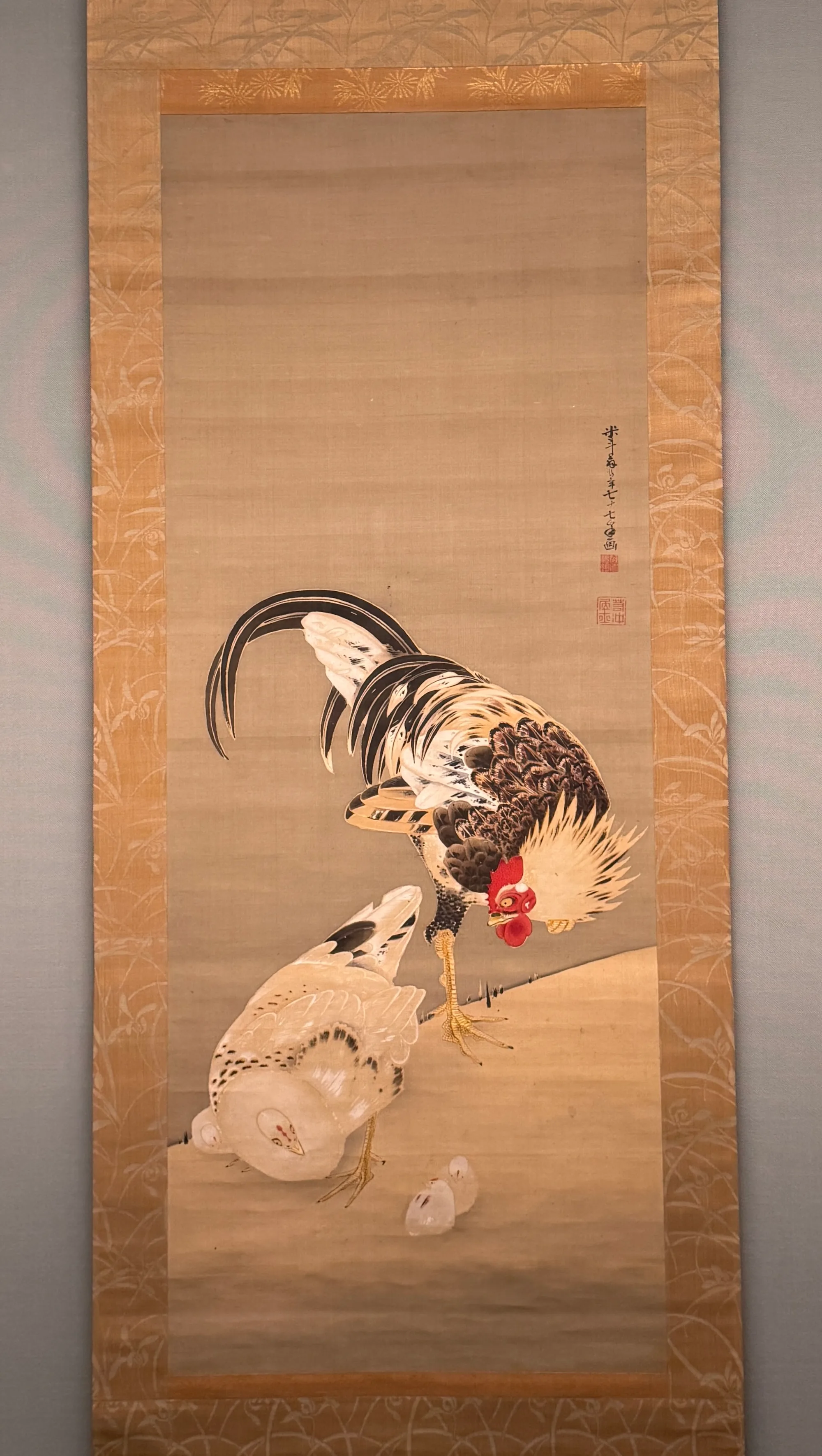 極彩色の鶏の絵も展示されているので、併せて紹介しておこう。若冲77歳頃の作品という《群鶏図》だ。若冲が描く鶏には雄鶏が多いというが、この絵では雄鶏だけではなく、雌鶏とひよこを描いている。鶏の親子でS字を描いているのは、若冲の構図の妙だ。