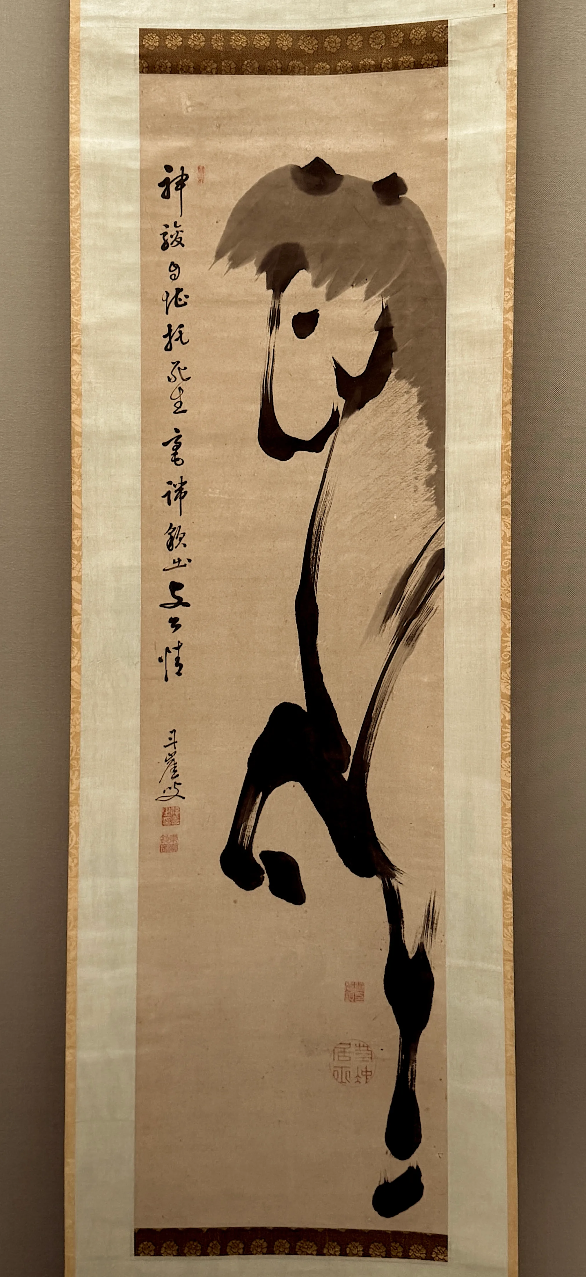 まず、半身しか描いていないところが面白い。それなりに大きな絵であるにもかかわらず、顔をはじめとして相当な略筆で描かれており、体や足を表した太い線が、馬という動物がもともと持っているパワーを表現している。薄墨で描かれたたてがみの描写も、素晴らしい。馬が前足を上げた反動を描き出しており、全体的に動感の表現が半端ないのだ。