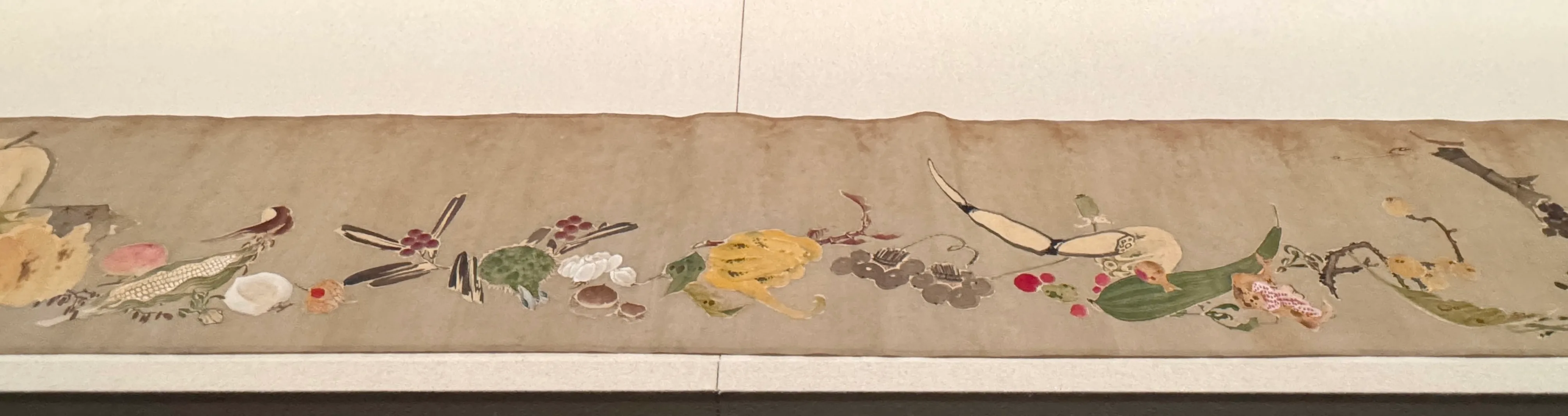 目玉作品は、存在こそ知られていたものの数十年間表舞台から姿を消していたという若冲の絵巻物《果蔬図巻(かそずかん)》だ。欧州からの里帰り品と聞く。全長は約3メートル。84年の生涯を過ごした若冲の70代の作品とのことだ。その名のごとく”果物と野菜”(以下「果蔬」)だけが描かれており、背景は無地である。若冲には《菜蟲譜(さいちゅうふ)》(佐野市立吉澤記念美術館蔵、本展には未出品)という、やはり果物と野菜を昆虫やかえるなどの小動物と並べて同時期に描いた絵巻物があり、この時期の若冲を研究するうえで貴重な作例が追加されたことになるという。
