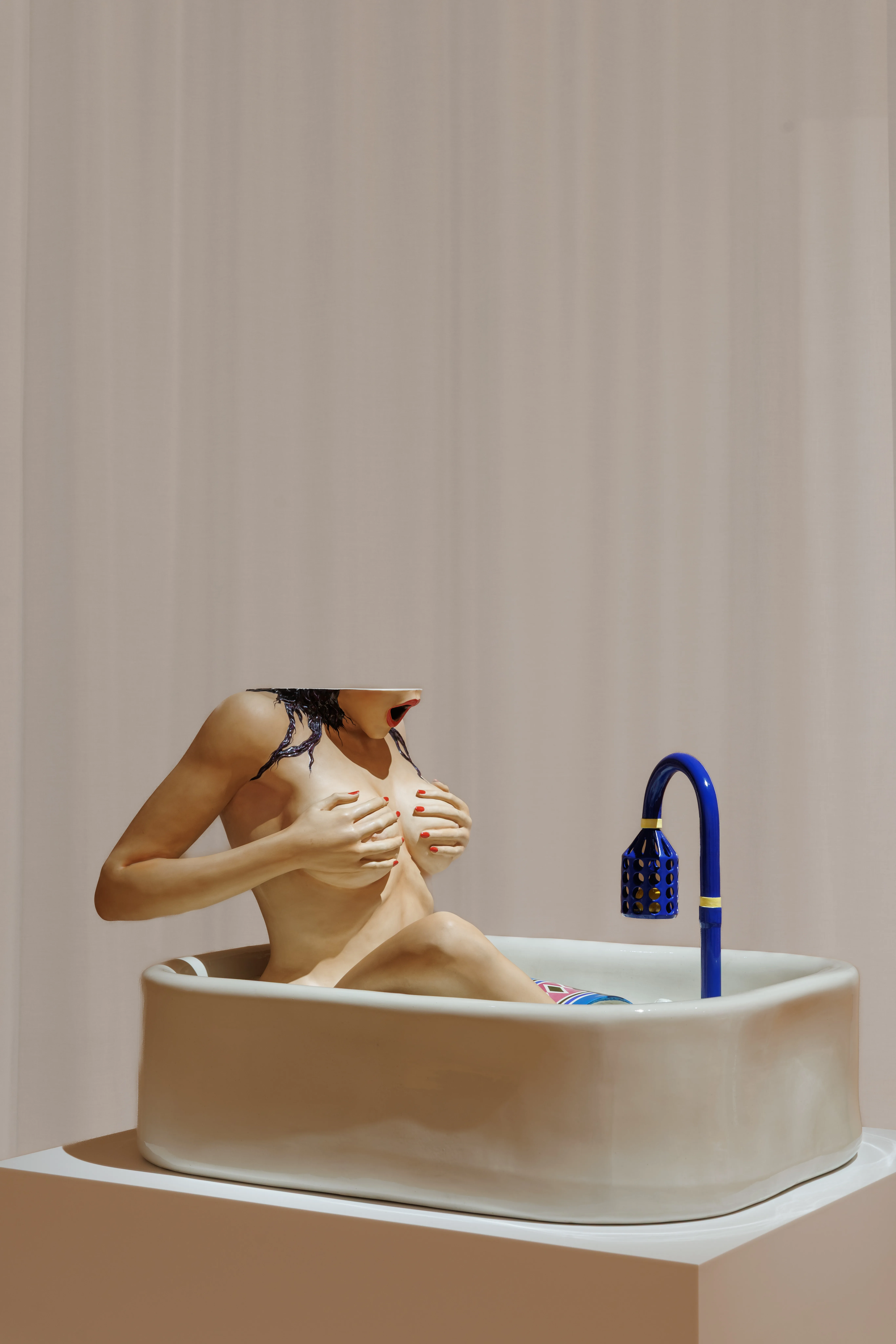 悪趣味以下の3点も同様だ。典型例は、入浴中の女性が突然現れたシュノーケルに驚いて乳房を隠すという設定の《Woman in Tub》(1988)。磁器に写実的な彩色を施したリアルサイズの裸婦像は、大きく開けた口より上の頭部がない。ありえない設定と相俟って、ポルノグラフィックというよりもコミカルな印象を受けるが、これは発表の翌年から始まるラ・チッチョリーナとの協働の先触れだろう。アーティストと元ポルノ女優は「Made in Heaven」シリーズ(1989〜91)などで、自分たちが愛を交わす姿を堂々と、写真や絵画や大型ビルボードに、磁器やガラスや大理石などの立体に作品化している。