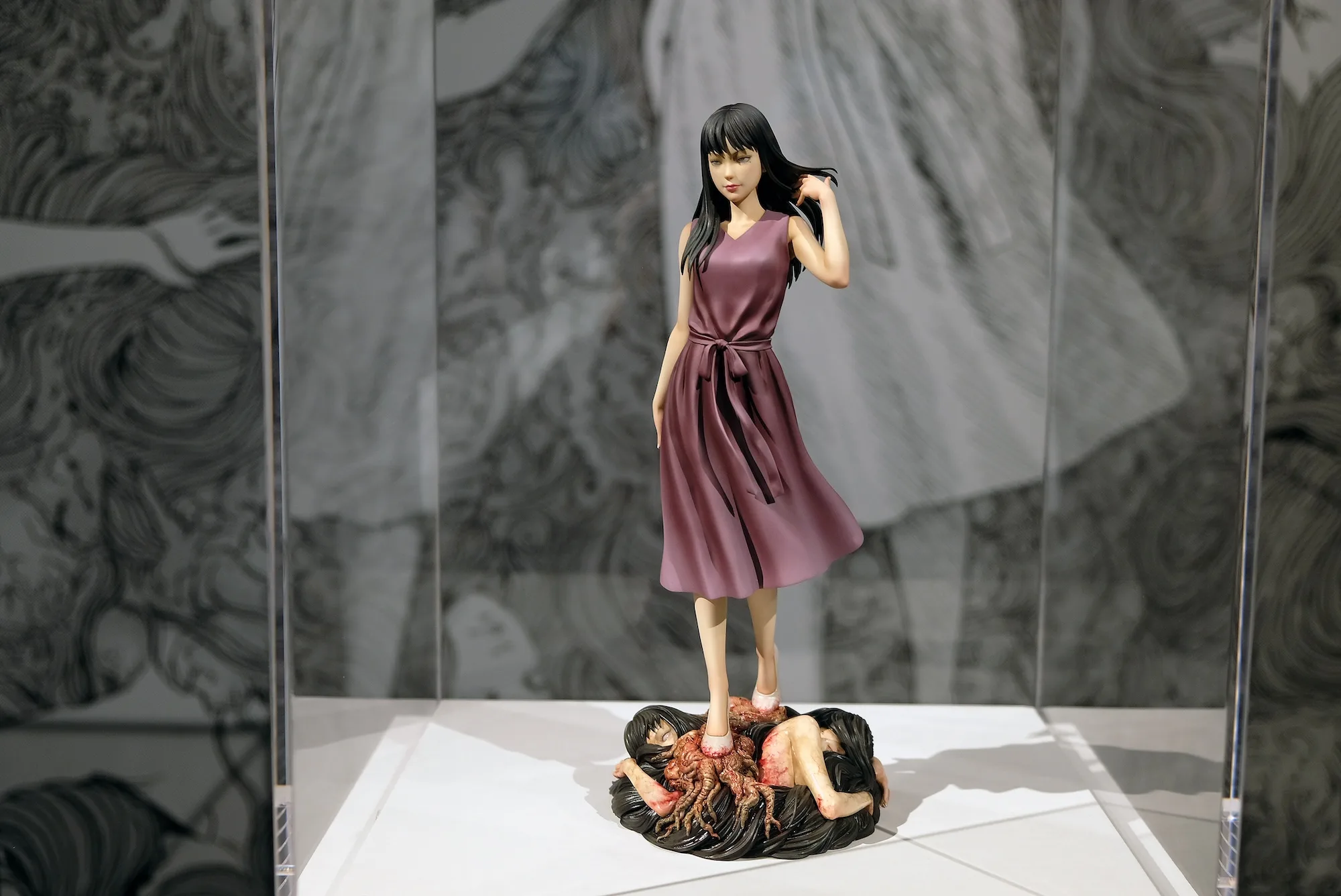 この展覧会のために制作された「富江」コラボレーションスタチュー(フィギュア)は、造形作家の藤本圭紀が原型を制作したもの。本展ではこのスタチューのほかに、伊藤潤二本人が彩色をほどこしたスタチューも展示されている。