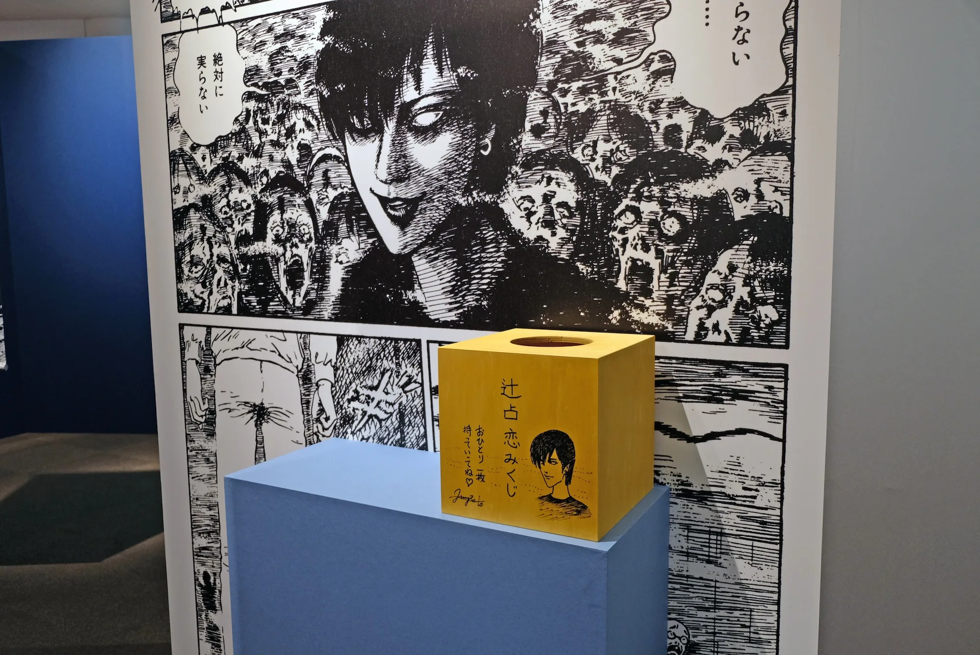 本展の開催にあたり、プレス内覧会に登場した伊藤は「37、8年、絵を描いてきたが本当にあっという間。それぞれに思い入れのある作品が多い。造形作家の藤本圭紀さんとのコラボレーションで制作した『富江』の新作フィギュアなども見てもらいたい」と語った。また、「展示にあたって、(主催者である)朝日新聞社や世田谷文学館の学芸員から多くのアイデアをもらったが、『死びとの恋わずらい』に登場するおみくじコーナーは自分のアイデア。おみくじは凶や大凶の割合が多いように思うが気にしないでいただきたい」と笑って紹介した。そして「現在、マンガを描くよりも、独自の関節の仕組みを持つポーズ人形を作ることに熱中していて、会期中にそれらも展示したい」と、会期中に展覧会の内容がさらに更新される可能性も語った。