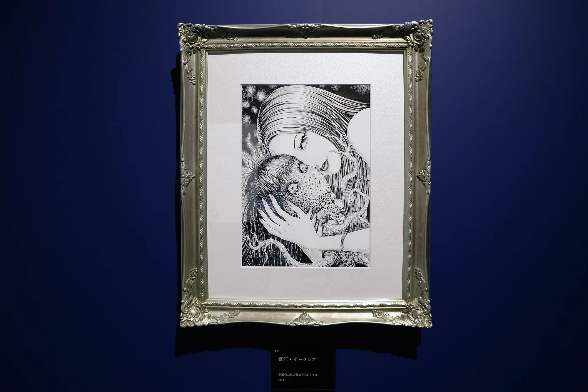 展覧会は、マンガの原画やイラスト、挿絵などや下絵、資料などを合わせて約600点を、序章を含めて全5章構成で展示する。冒頭を飾るのはこの展覧会のために描き降ろされた新作イラストのひとつ《富江・チークラブ》。