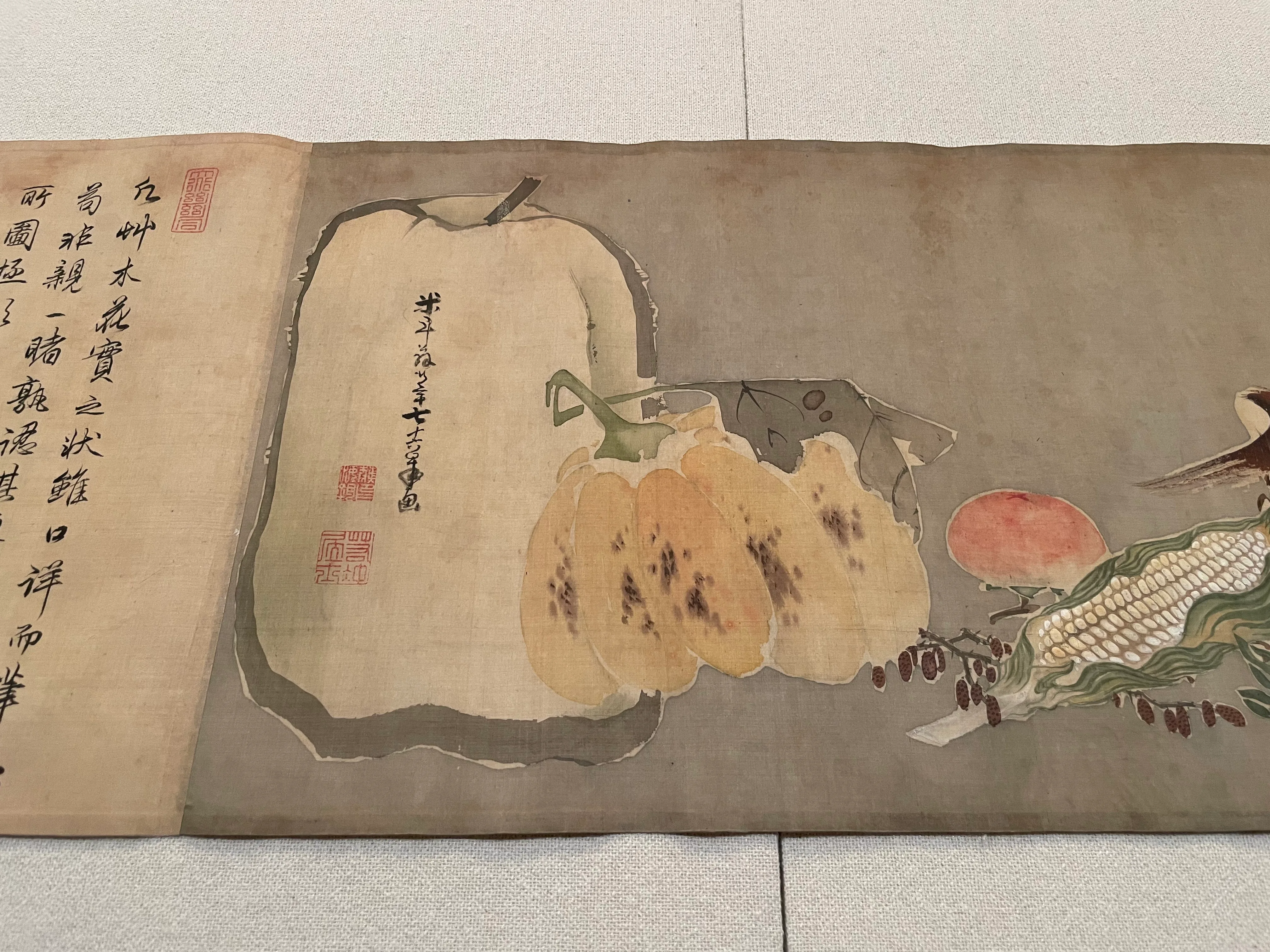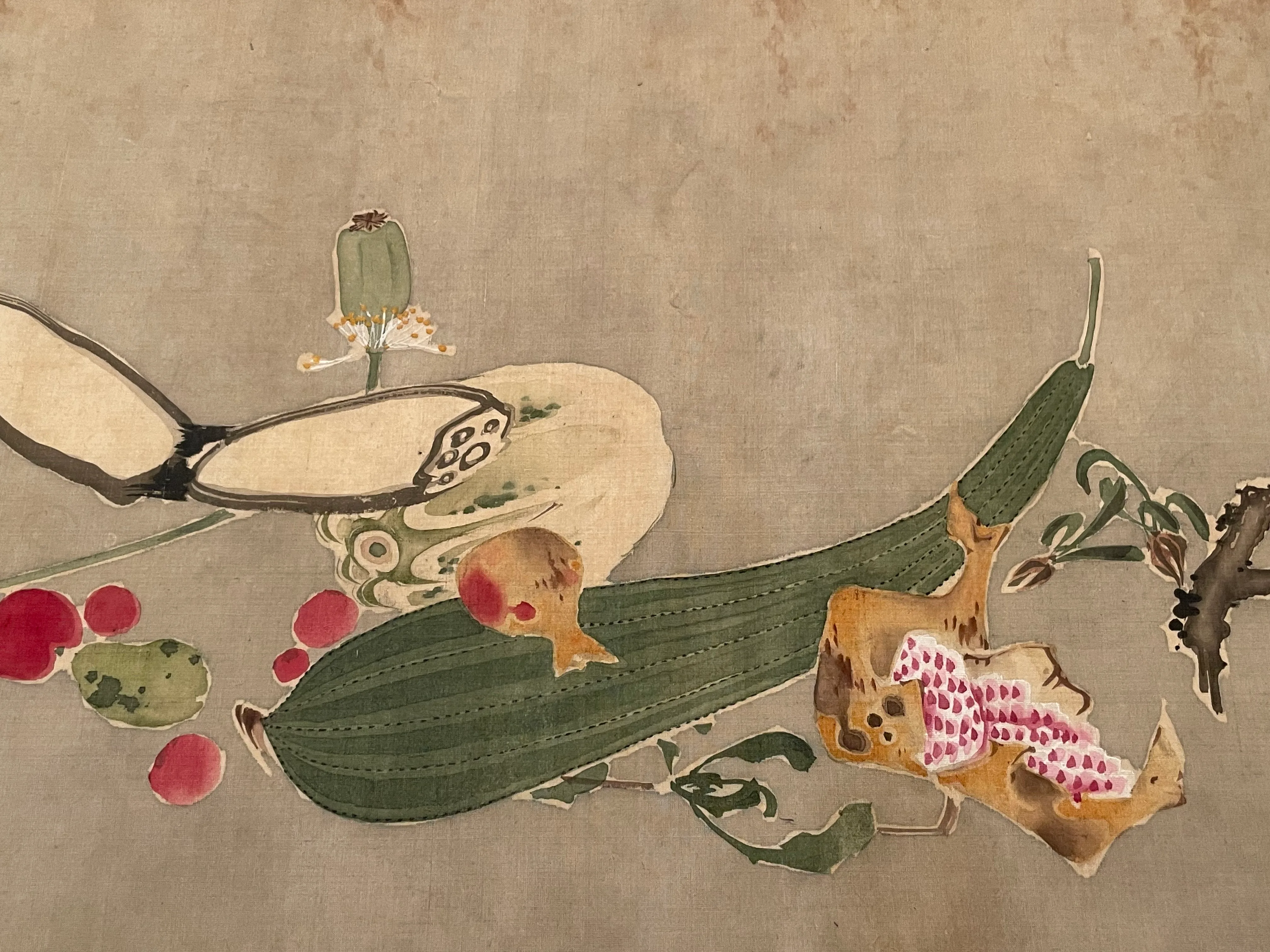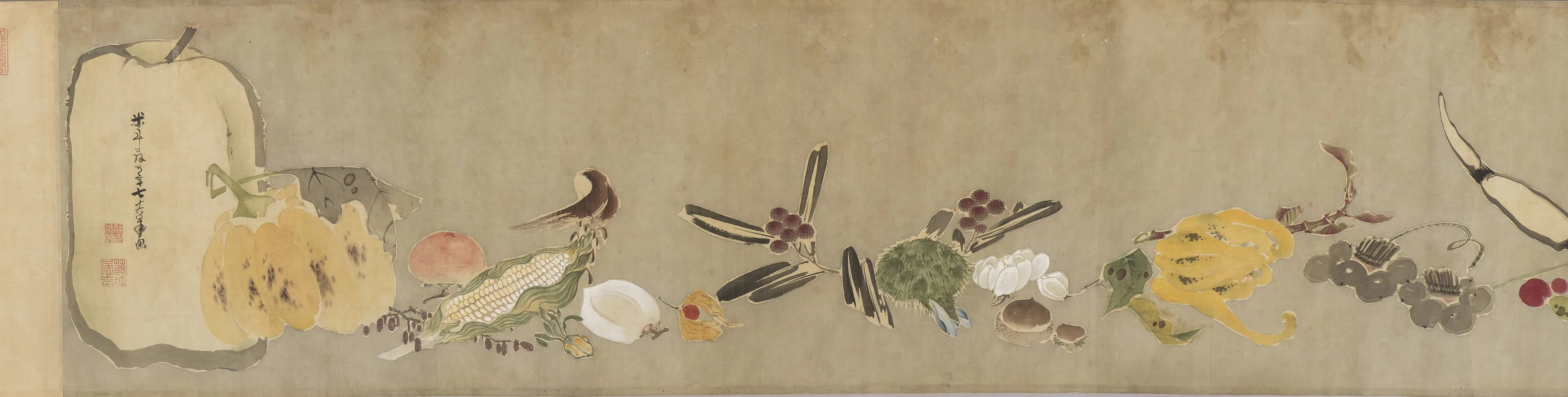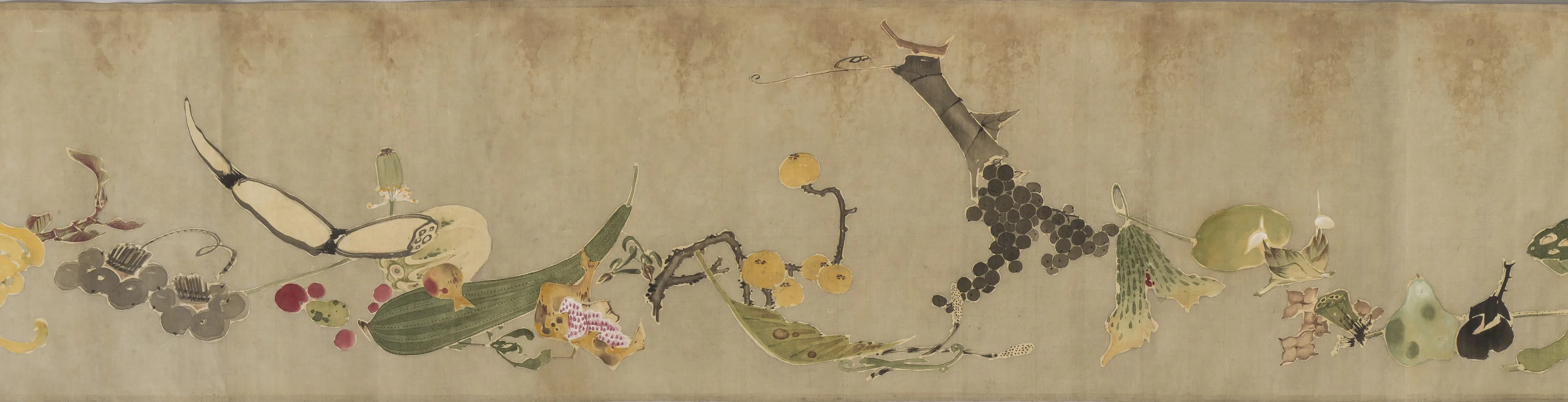 この絵巻《果蔬図巻(かそずかん)》も、《菜蟲譜》と同じく、野菜のモチーフを描いていて、同様に生き生きして見事であるが、構図は気の向くままという感じもあり、初々しい。《菜蟲譜》の予行というわけではないだろうが、よりリラックスして描かれた作品という印象を与える。