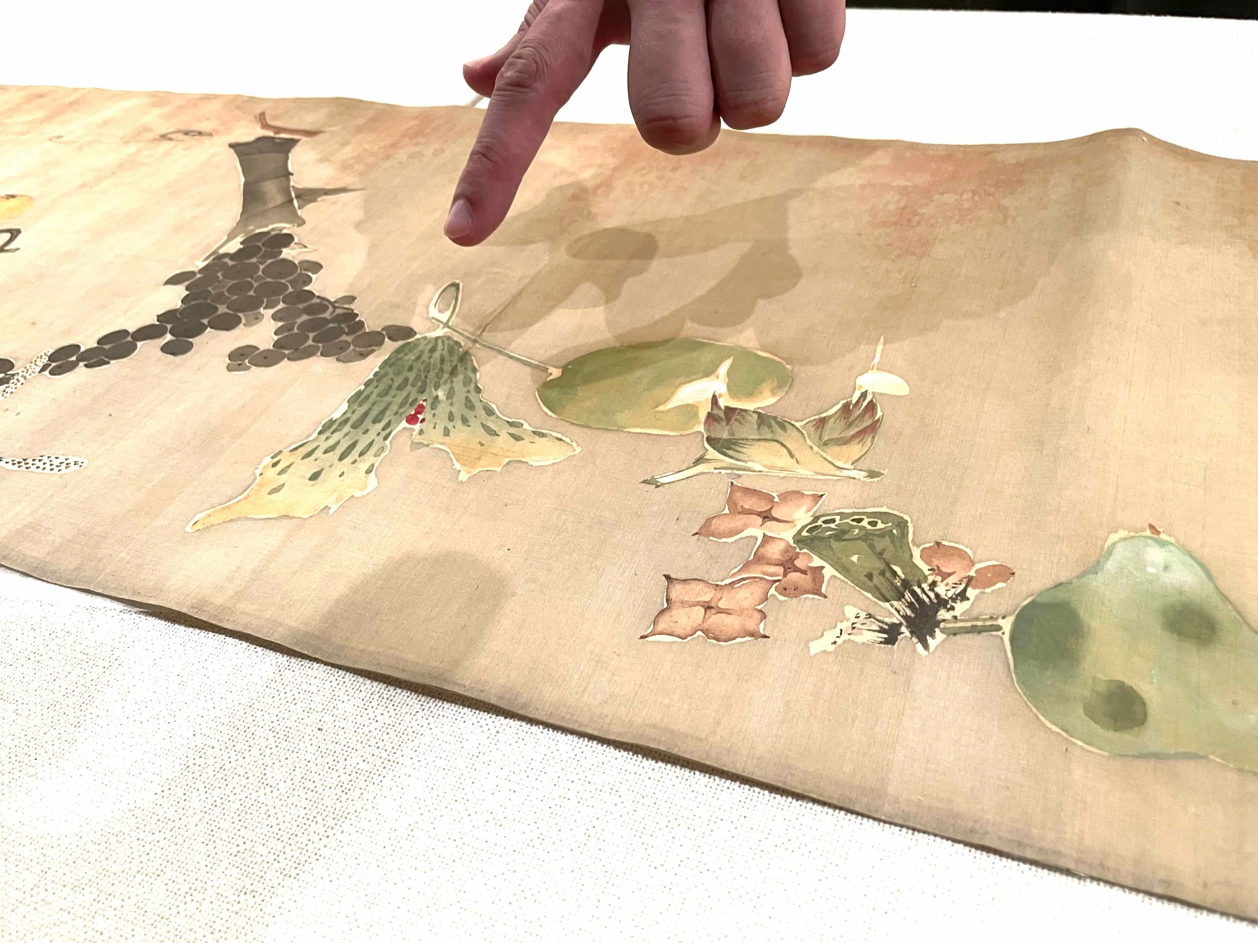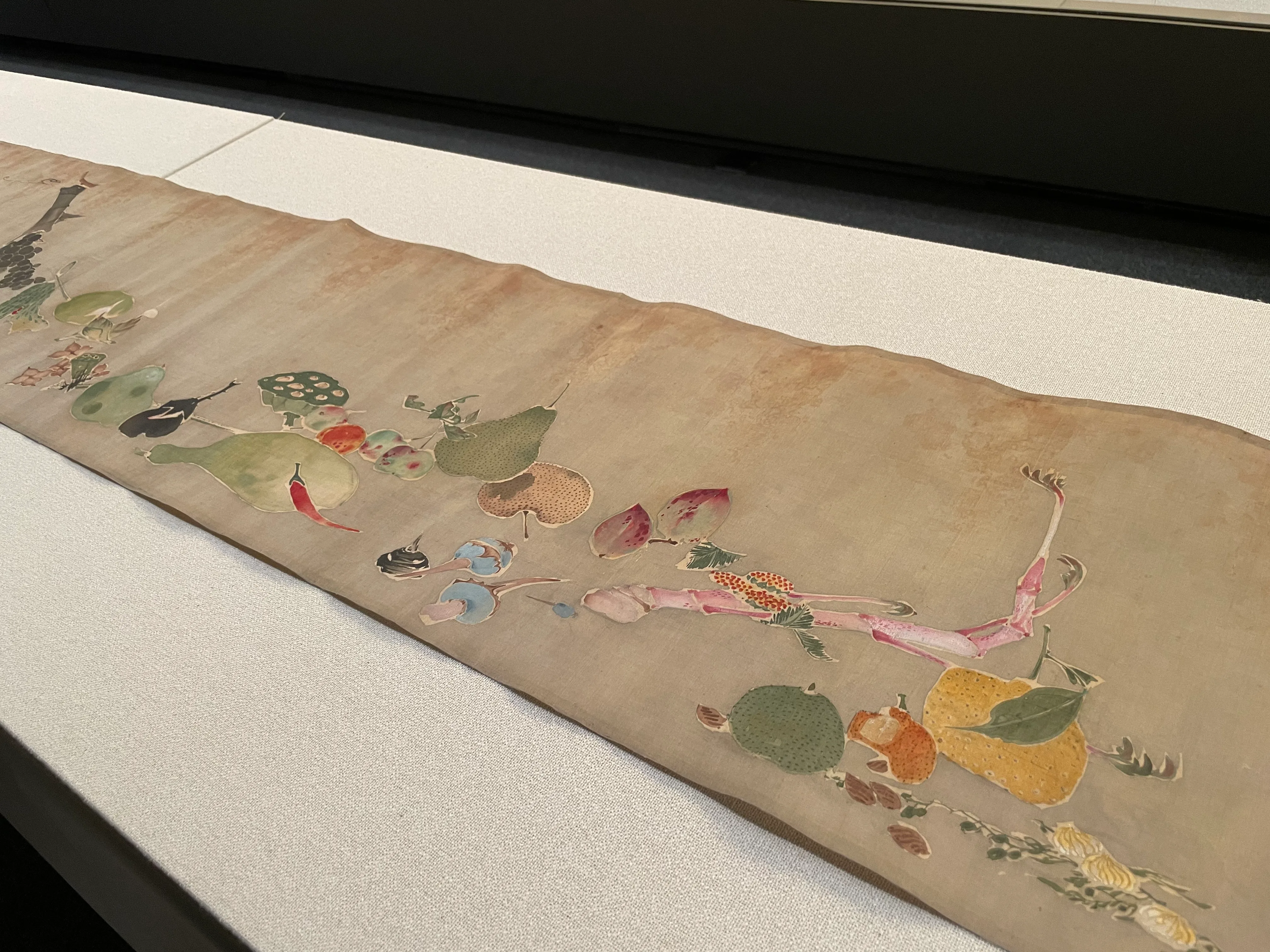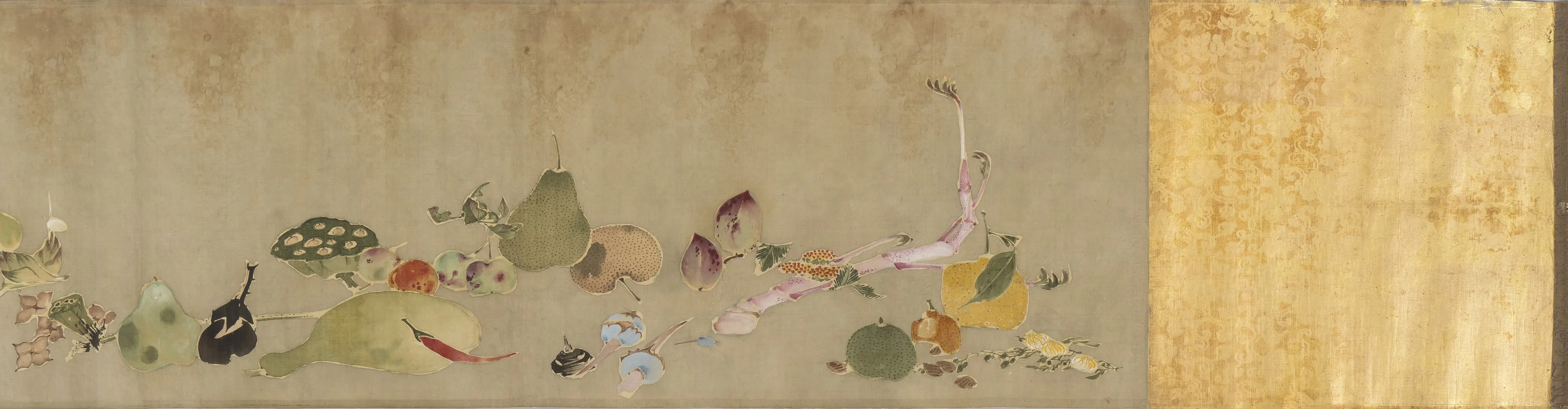 絵巻は、絹本着色の縦30.5cm、横277.5cmの大作。菊の花から始まり、ウド、クワイ、梨、ナスなど、40種類の花、野菜と果物が、季節に関わらない順番で描かれている。ランダムに、様々な角度に配置された野菜たちからにじみ出る軽快な雰囲気、そして色彩の鮮やかさ。とくにグラデーションの美しさには、保存の良さが感じられる。