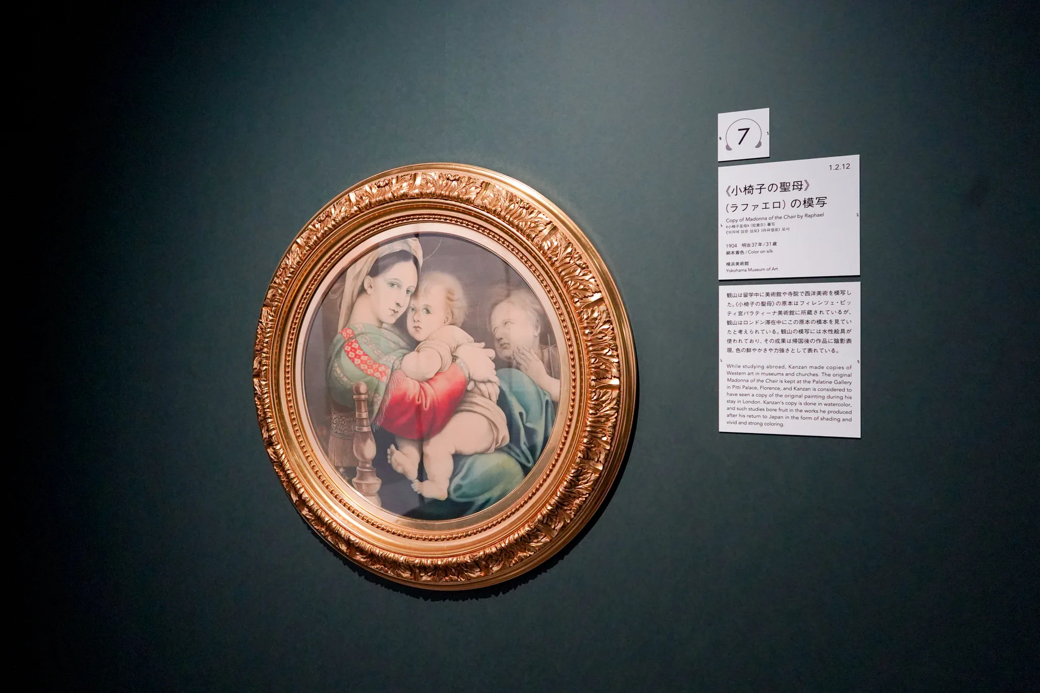 続く第2章では、1903年から2年間にわたるイギリス留学の成果が紹介されている。日本画家として最初の官費留学生として渡英した観山は、日本画との親和性を持つ水彩画を研究するとともに、各地の美術館で西洋絵画の模写にも取り組んだ。たとえば《〈小椅子の聖母〉(ラファエロ)の模写》(1904)はその代表例で、水性絵具を用いて油彩画の表現に迫ろうとした跡が見える。