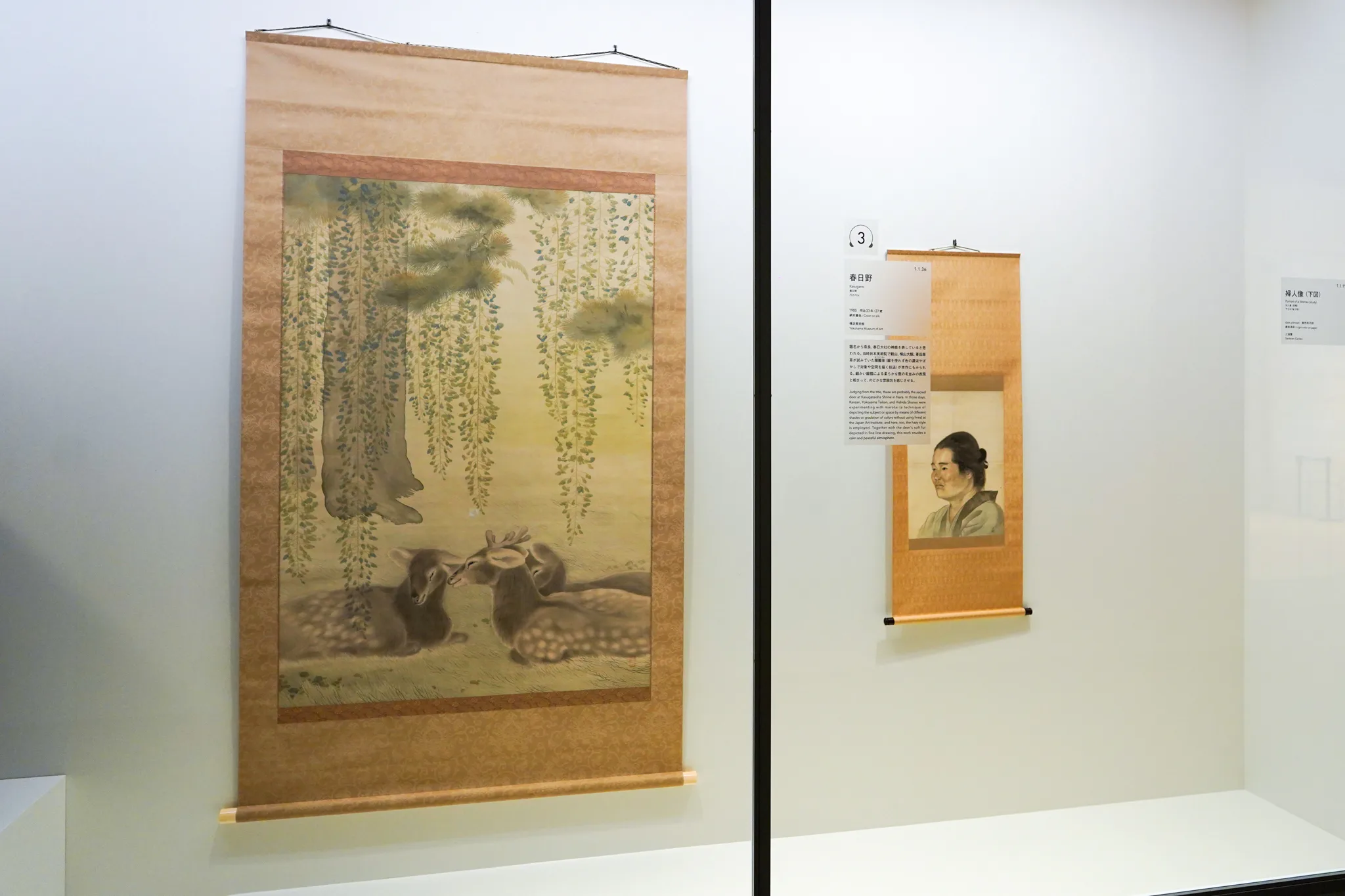 第1部は観山の生涯を4章に区切り、年代順に画業を追う。展覧会の冒頭では、美術学校時代から日本美術院初期の作品が並ぶ。ここで注目したいのは観山が27歳で描いた《春日野》(1900)だ。春日大社の神鹿を描いたと思われる本作には、当時大観・春草らと試みていた「朦朧体」——線を使わず、色の濃淡とぼかしで対象を描く技法——が用いられており、細かい線描による柔らかな毛並みの表現と相まって、独特のおおらかさを醸し出している。