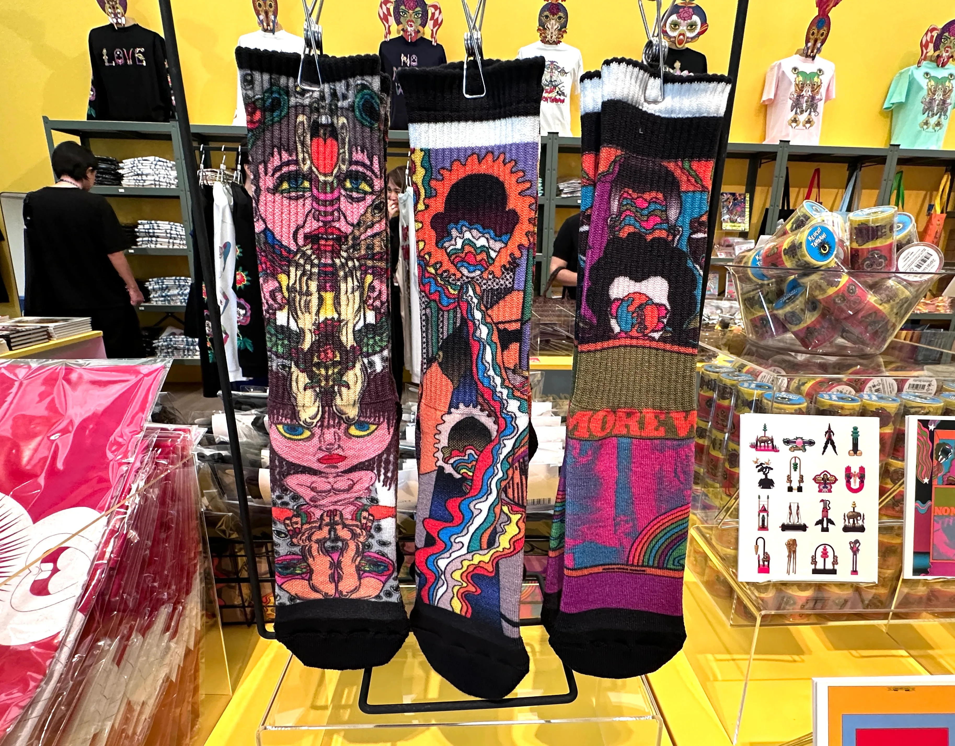 田名網作品をさりげなくコーディネートに取り入れたい人におすすめなのは作品の一部がプリントされたソックス。M、Lのサイズ展開でギフトにもおすすめ。価格は2970円(税込)。