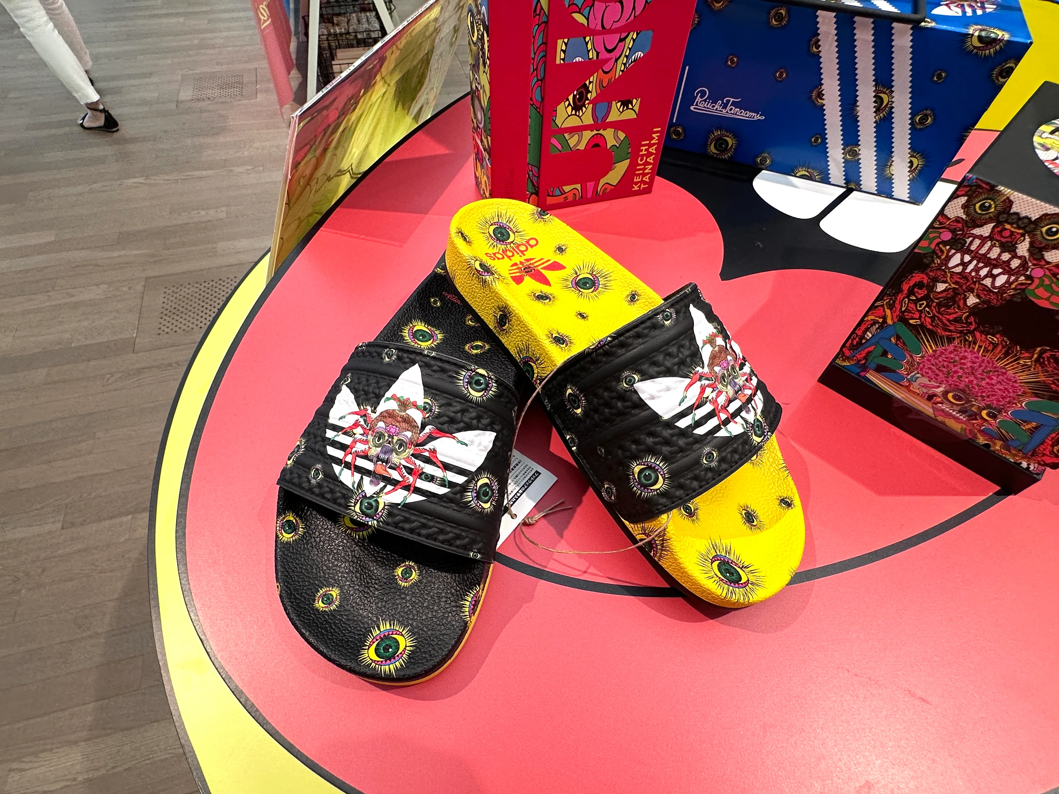 企業とのコラボレーショングッズから1点を紹介する。1972年の初登場以来、人気サンダルとしての地位を確立したアディダスのADILETTE。2019年のコラボレーション第一弾で制作された田名網敬一のアートワークをモチーフに、田名網の作品へオマージュを捧げている。価格は7700円(税込)。