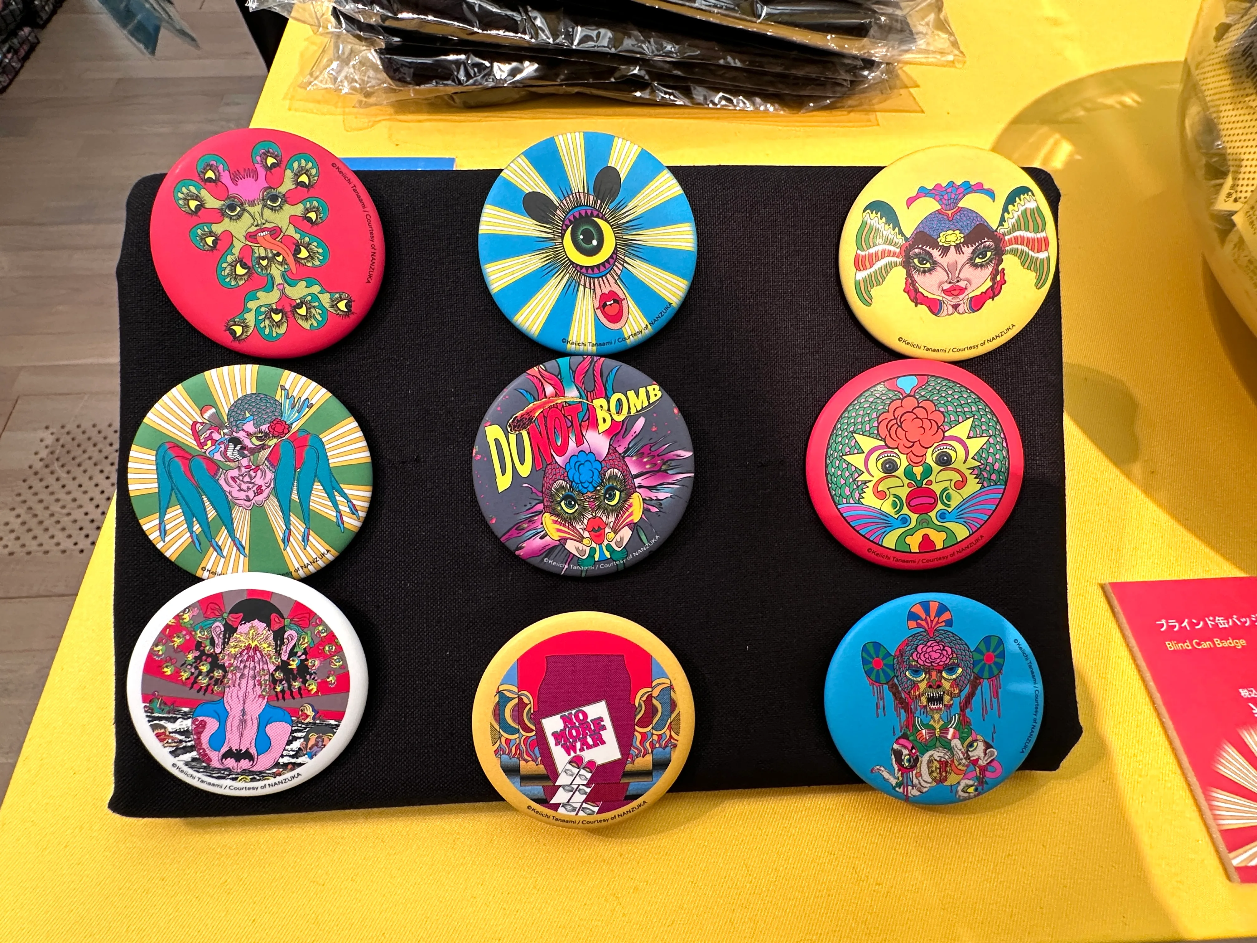 印象的なモチーフがプリントされた缶バッジは、袋を開封してのお楽しみのブラインド仕様。9種類コンプリートしたくなることうけあいだ。一般的な缶バッジと異なるマットな質感も魅力。660円(税込)。