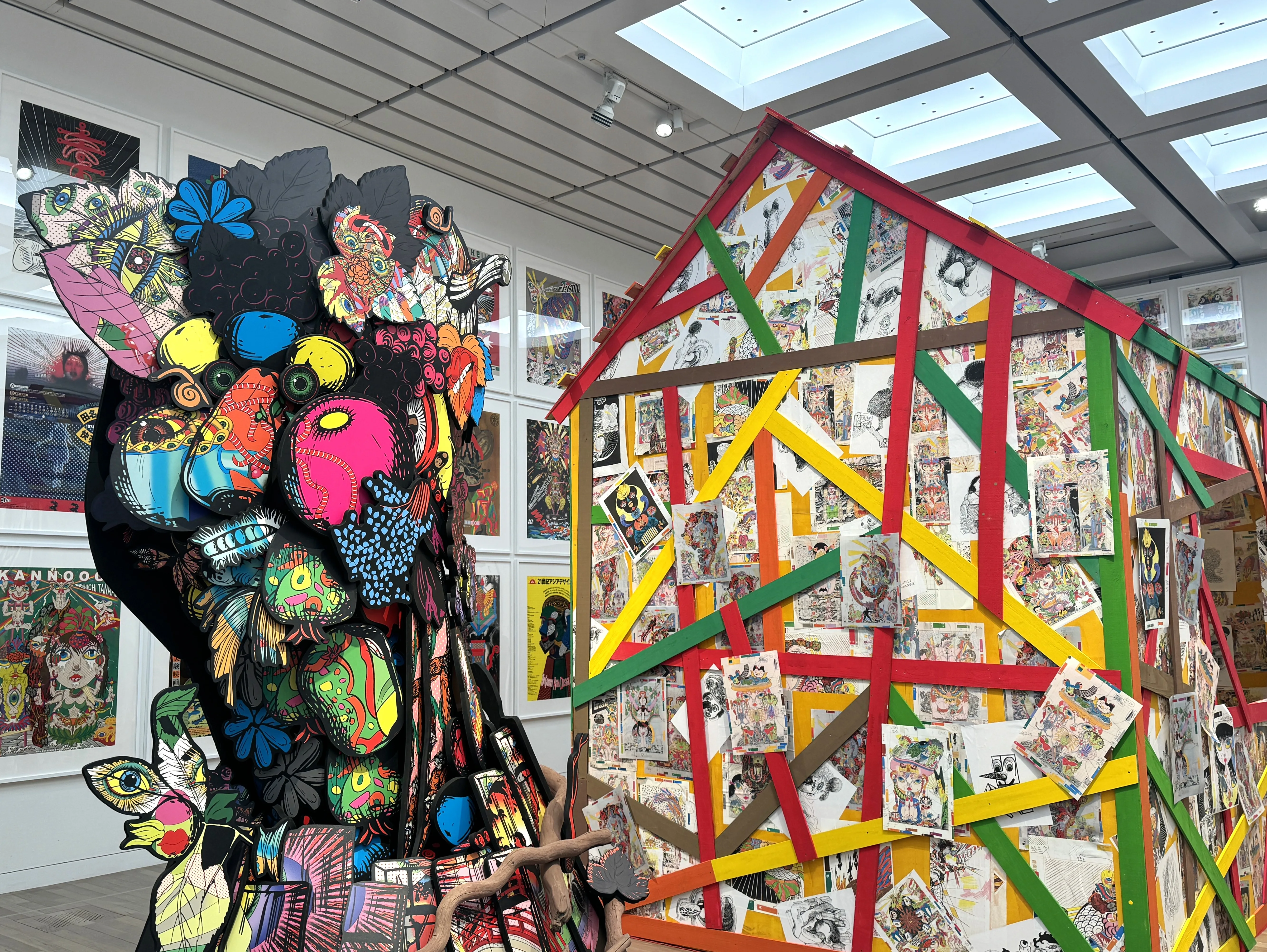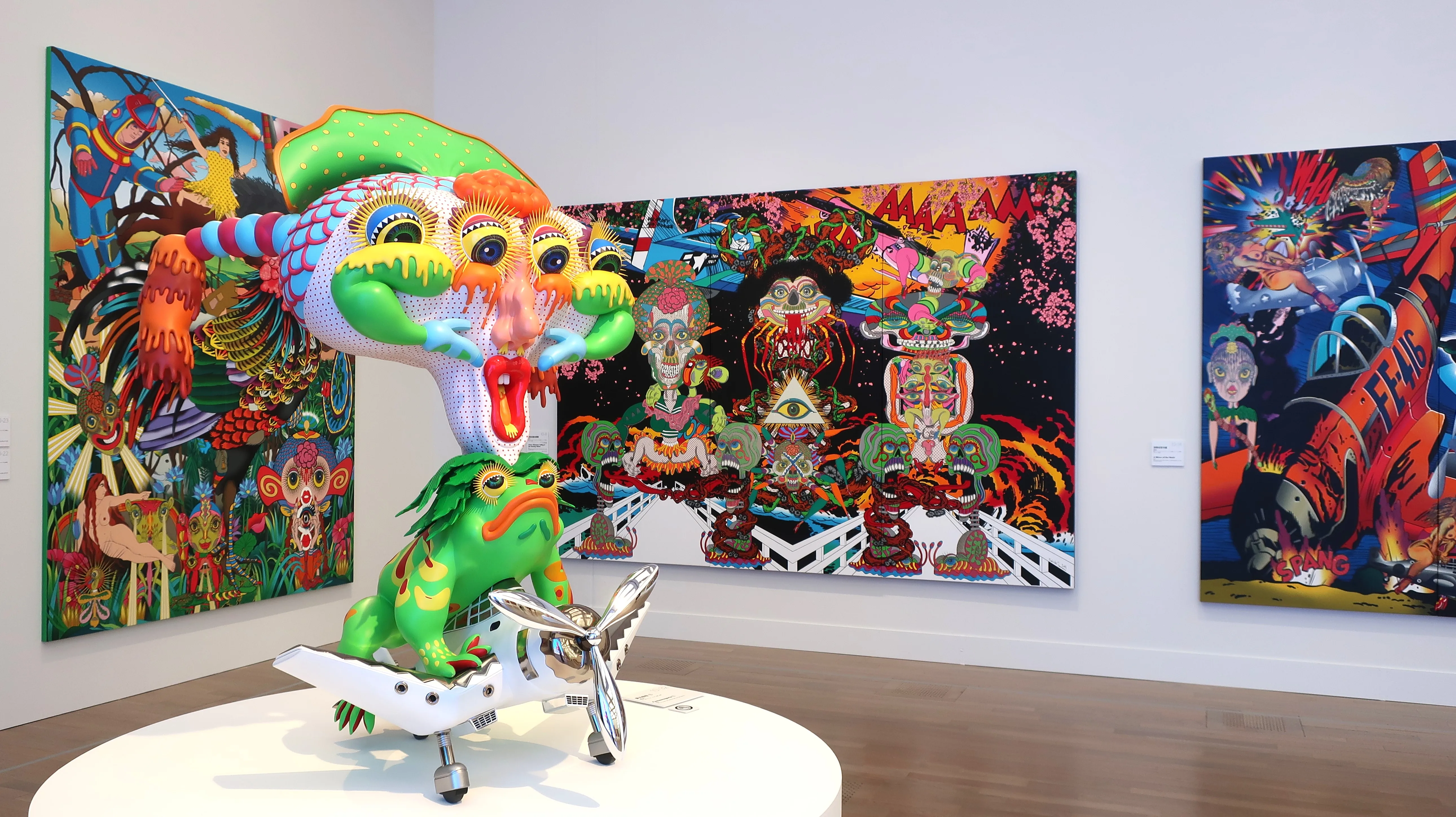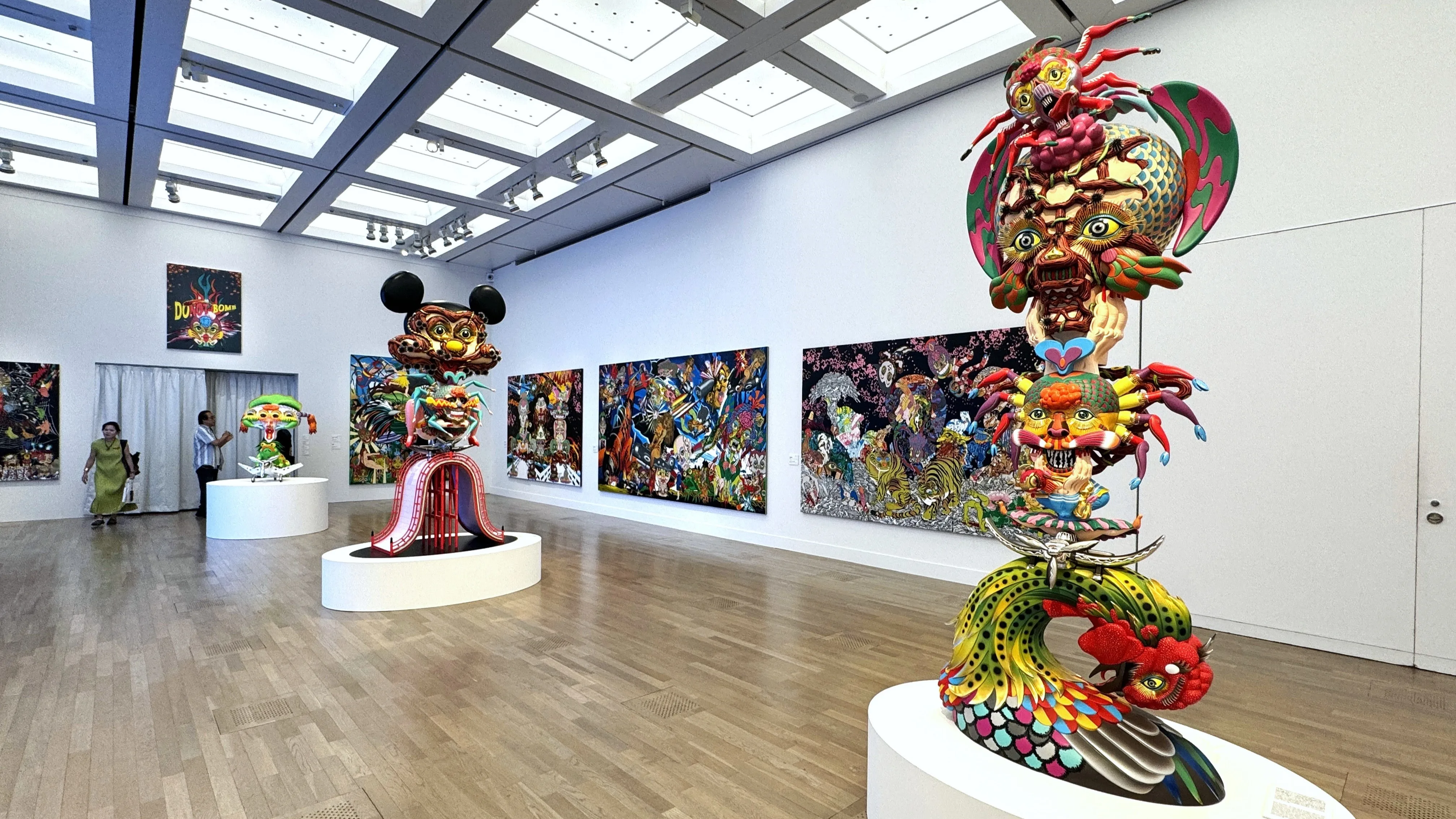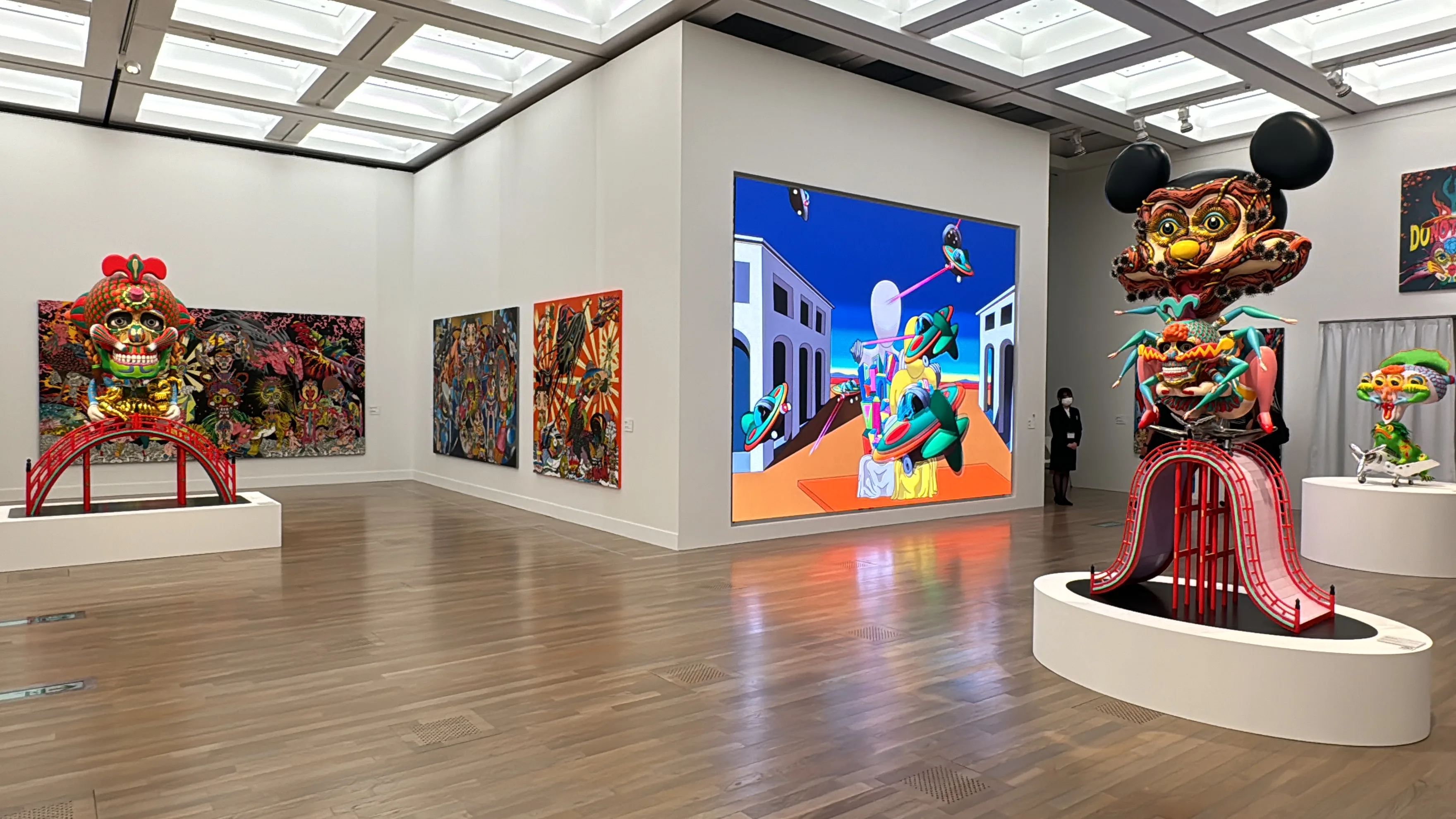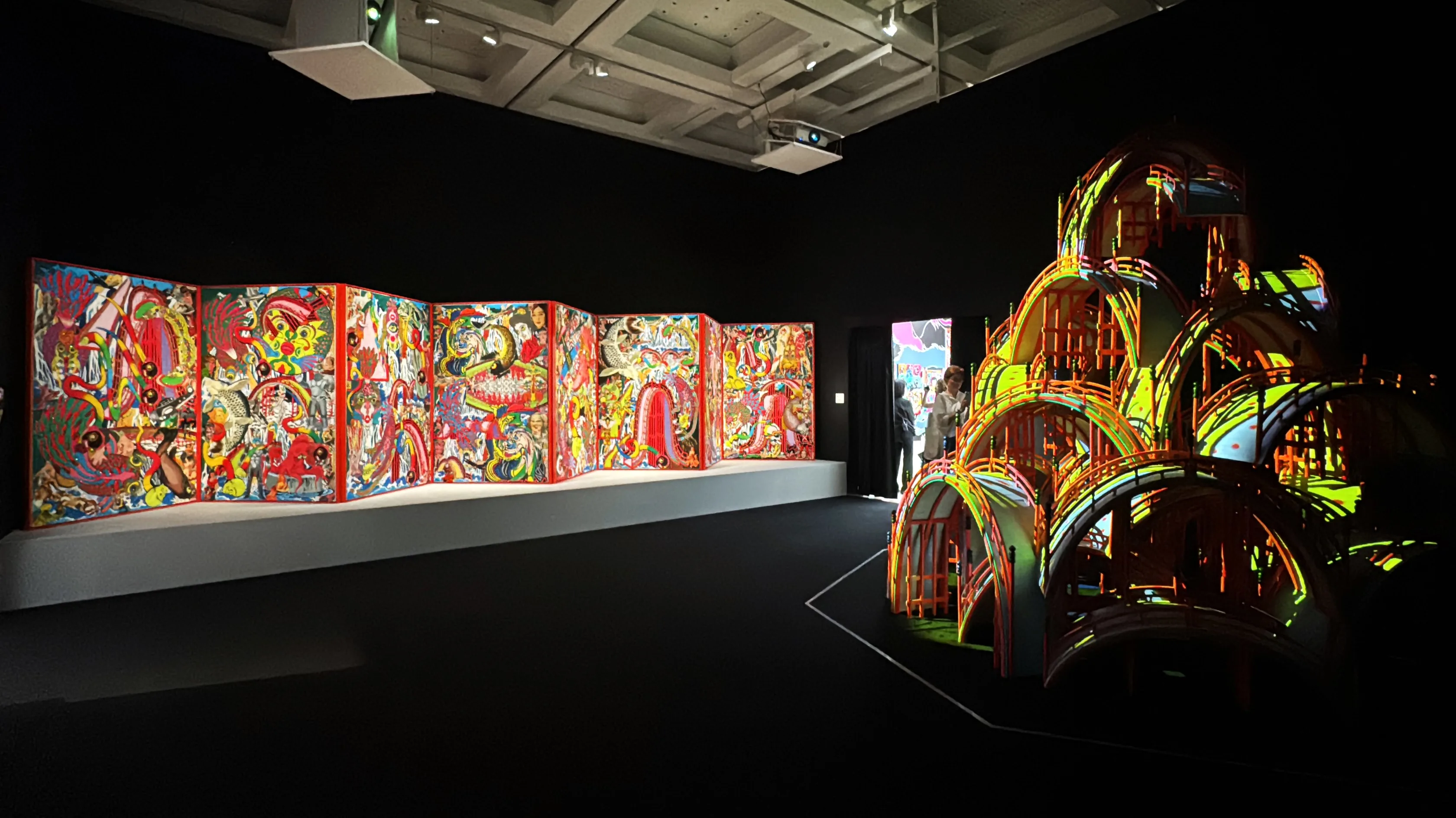 本展の終盤、第10章「貘(ばく)の札」は、柱のない大空間を活かし、2000年代以降に手がけた大画面の絵画や、FRPなどを用いた巨大な立体作品、デジタル・アニメーションを一堂に展示している。