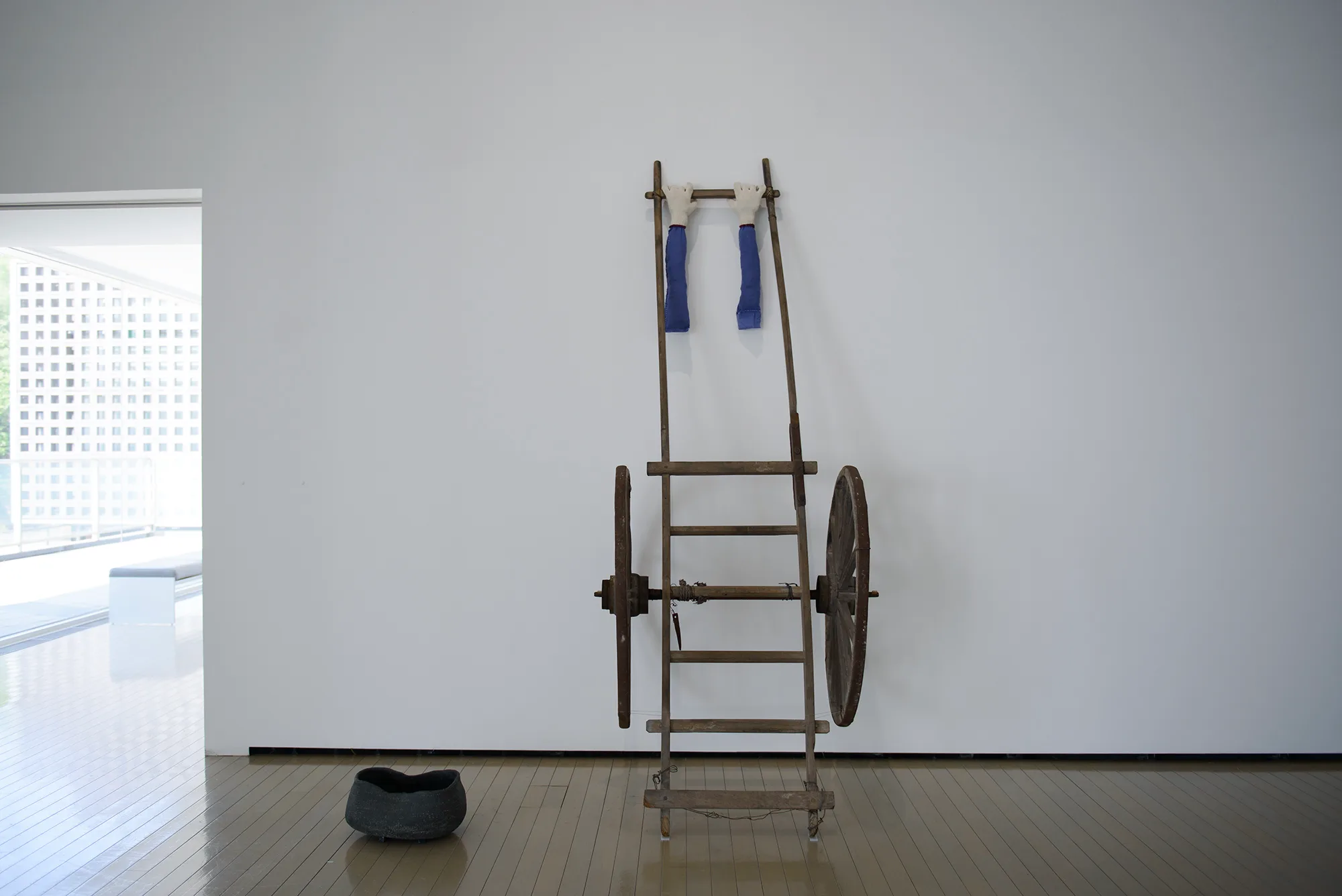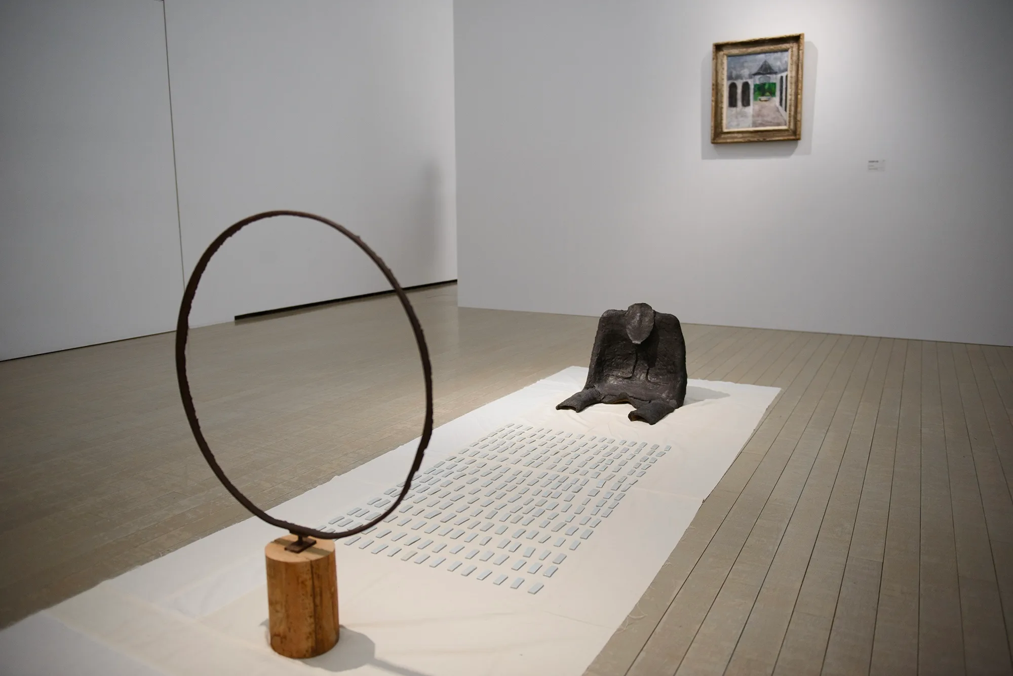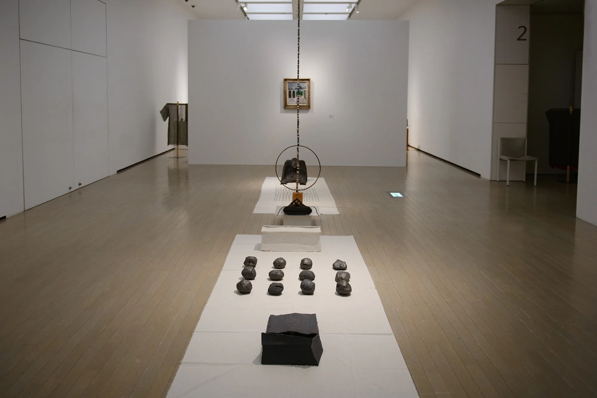 伊藤 そうですね。左右に同じタイトルの素描を展示したり、まったく違う作品を組み合わせたり、全体を通して「祈り」が見えてくるだろうと考えて展示しました。たとえば中央にリングがありますが、あれは、円相(注:一筆で円を描いた禅における書画の一種)からヒントを得た作品です。それが祈りのための道具のひとつとして象徴されていて、その奥に白い長方形が並んでいるのは、死者を納める棺を表している。そういうものが組み合わさって「祈り」が連想できるでしょう。