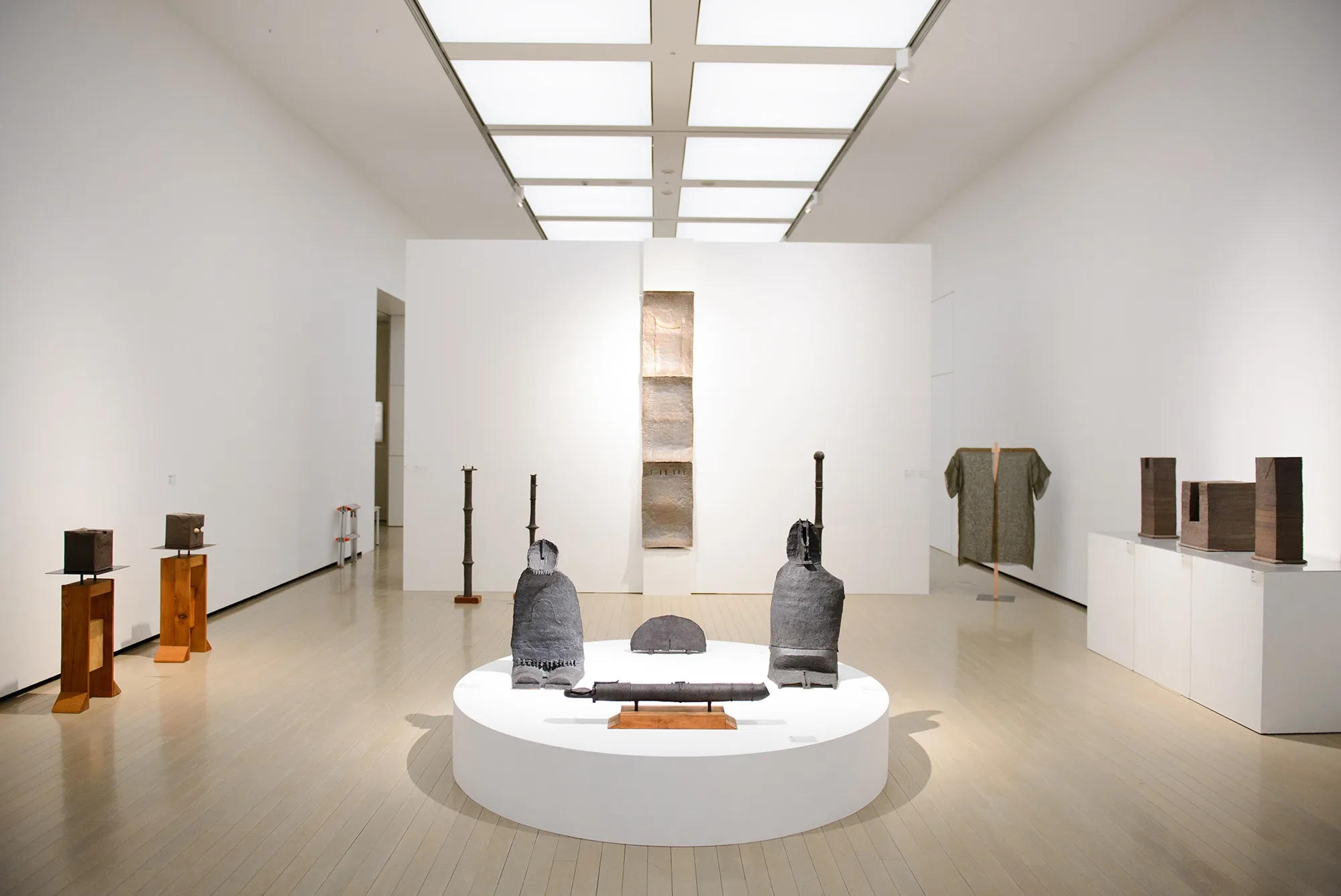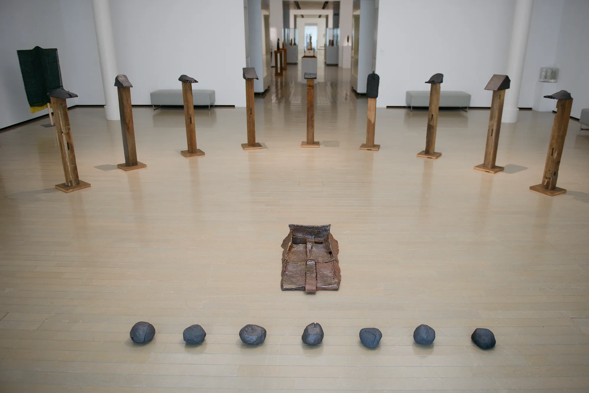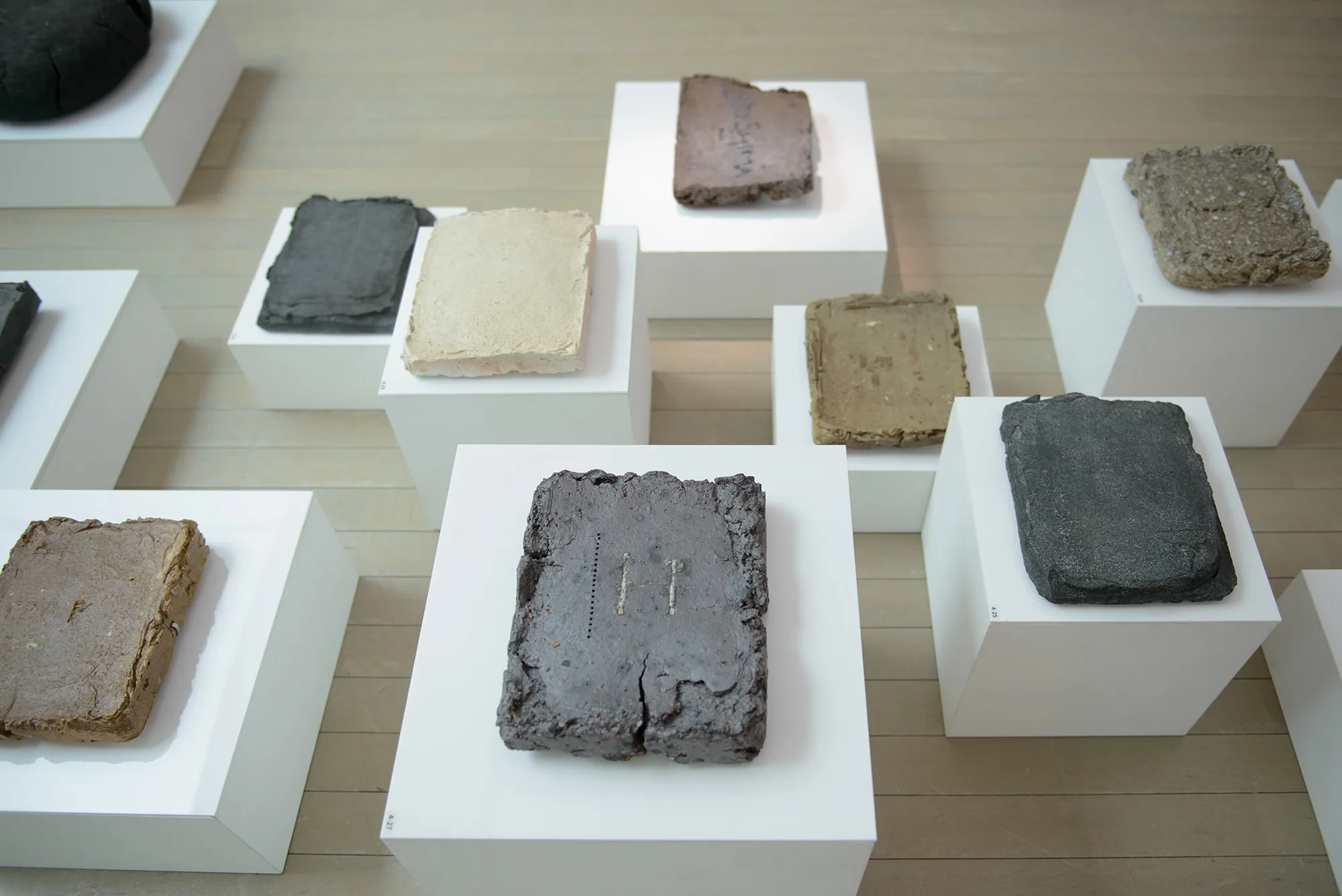 保坂 こちらの展示も、異なる素材や技法の作品が一堂に会し、インスタレーションが形成されています。空間の中央の床を占める「HIROSHIMA—土」のシリーズ(一瞬にして焦土と化した広島の大地をイメージしたという作品)はどのような技法で制作されたのでしょうか。