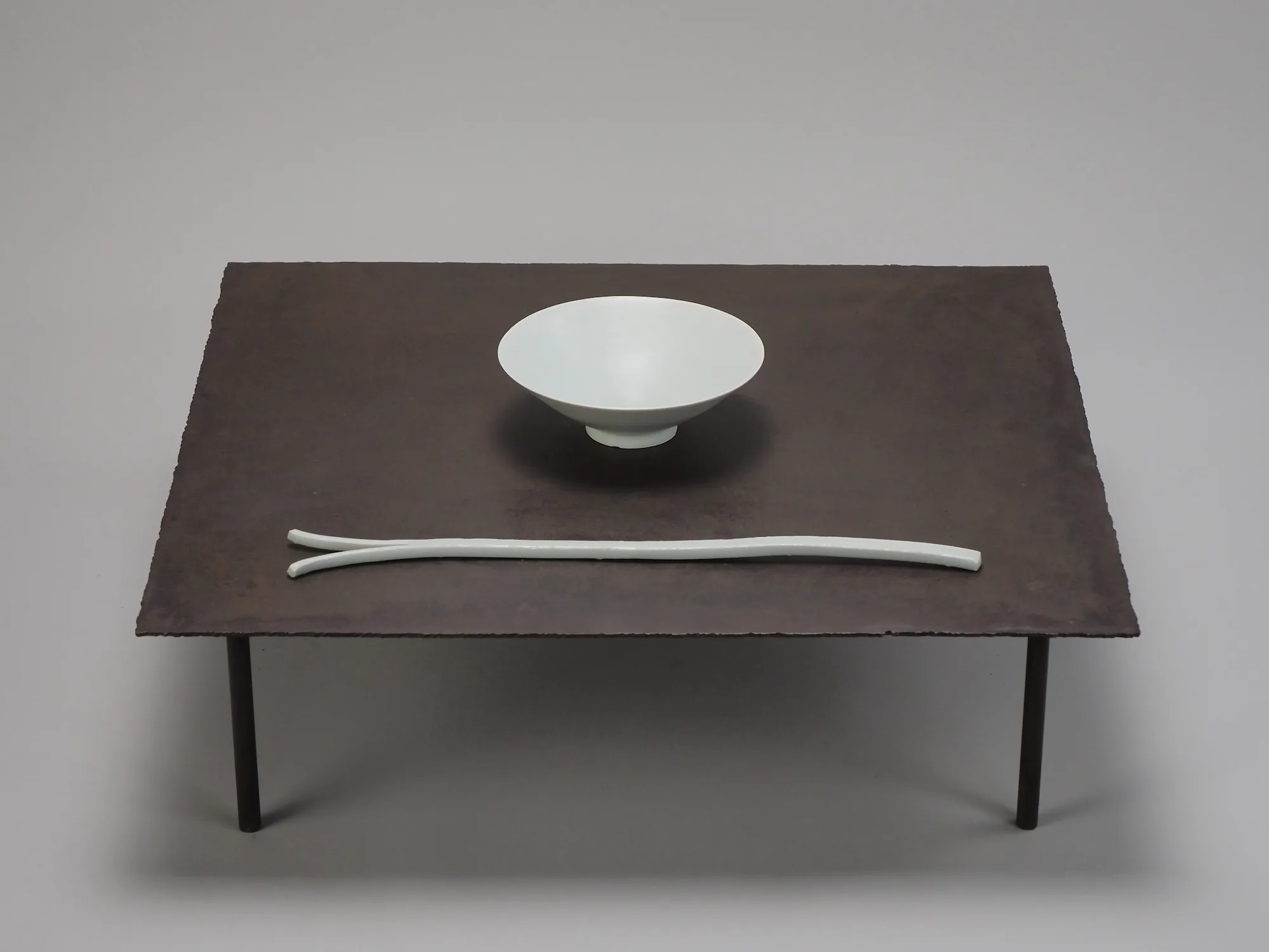 伊藤 どうなんでしょうね。うつわに関しては、当時、仕事として食器を作っていたんです。食器を作るにしてもいろいろ種類があるので、選択したのが、飯碗と湯呑みでした。5人家族であれば、5つの飯碗と5つの湯呑みがあるでしょう。では、その2種類に絞って作ろうと。そういうなかで、配膳というのかな、食卓における食器のあり方にとても興味をもちました。それでお膳のシリーズを作ったのです。同じ時期に鉄板の上に三宝を並べた作品も作りましたが、鉄と焼き物と、というように、異素材を組み合わせて空間を作る。僕の癖のようなものなのかな。かたちができたときに、組み合わさって空間がどう見えるか。作るプロセスにおいて、そういうイメージは重要な要素になっているのかもしれません。