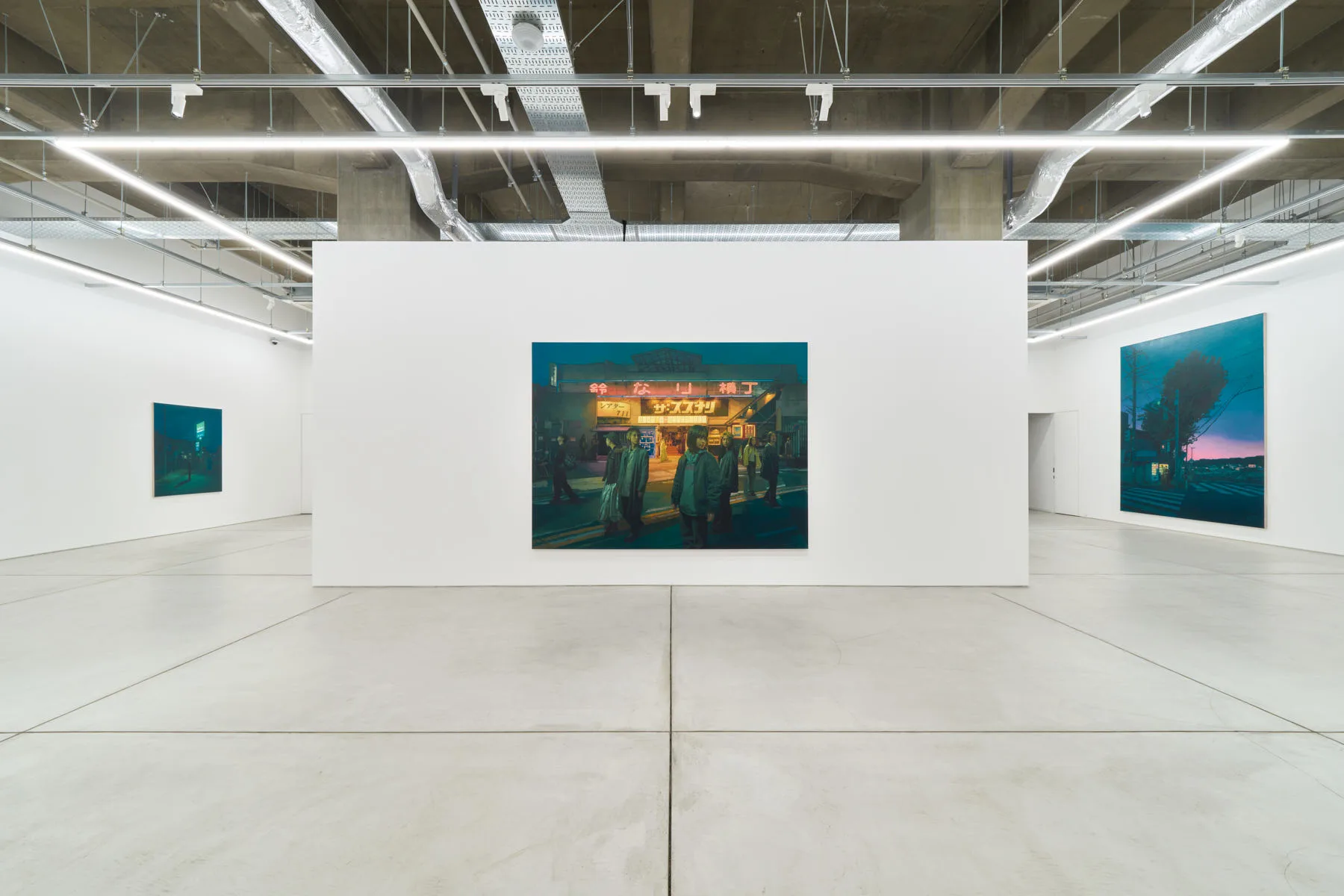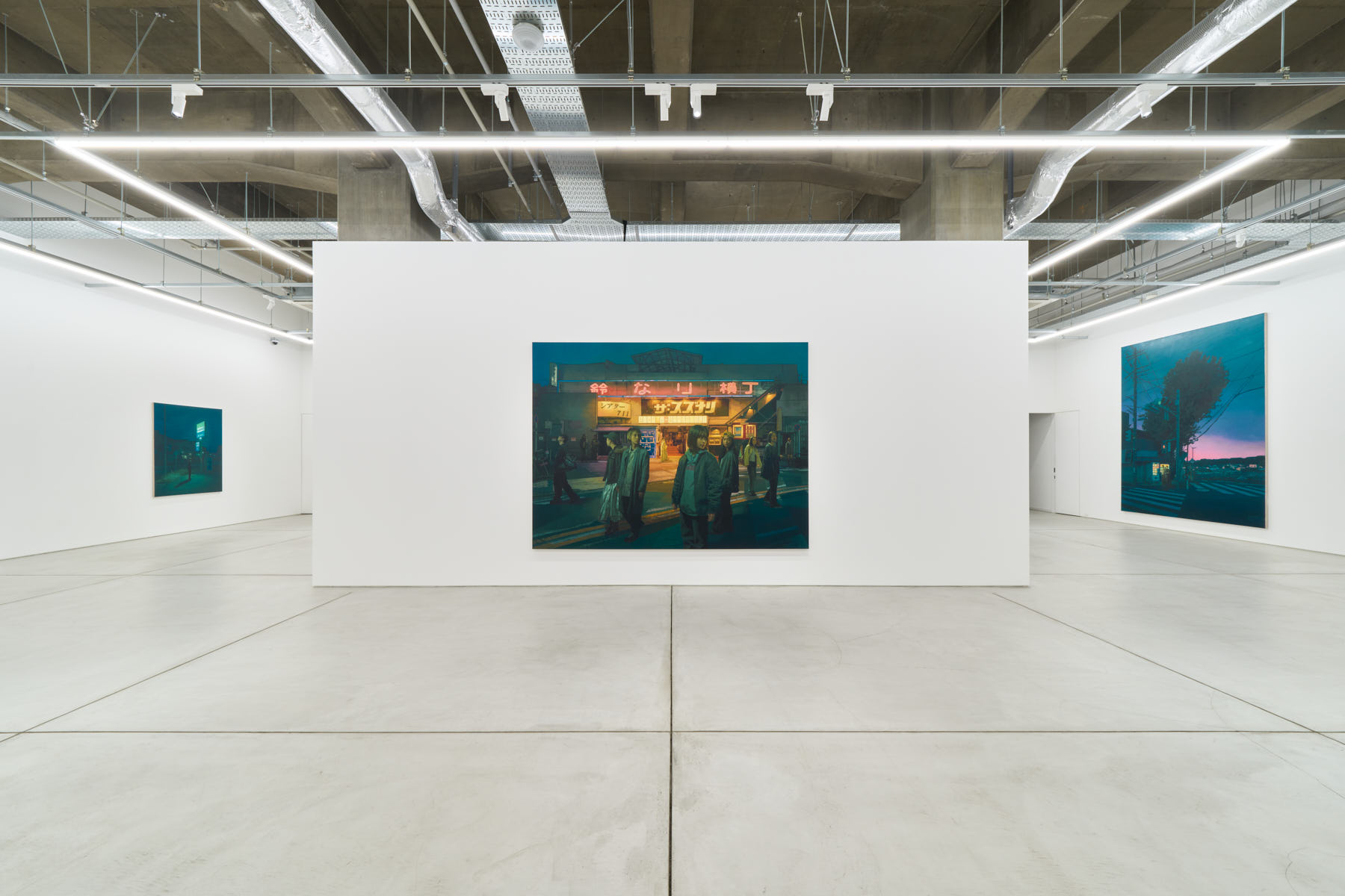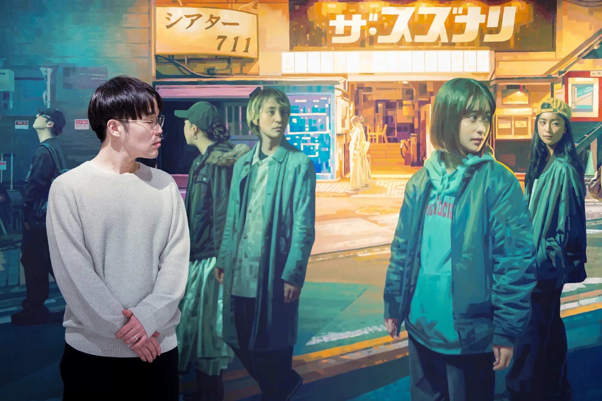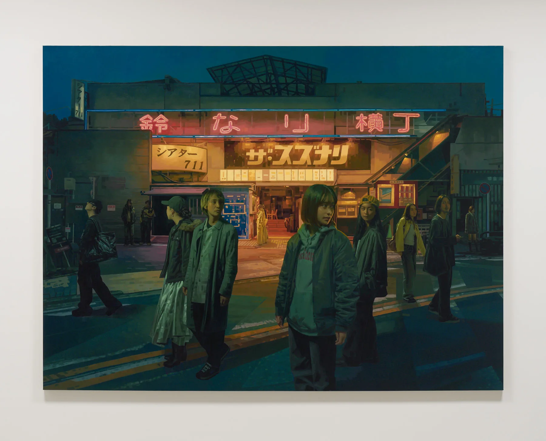 ネオンが眩い飲食店街を正面からとらえた、《Stories we told ourselves》という新作。横3m近い大画面は、実在の古びた建物の前を若者たちが行き交い、一見すると賑やかな盛り場が描かれているようだ。だが、よく見ると人々の視線はバラバラの方向を向き、人工光を背にした姿は少し暗く沈んで凍り付いたように静止している。