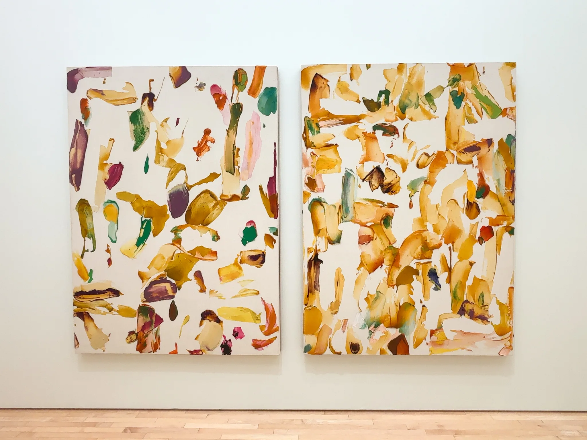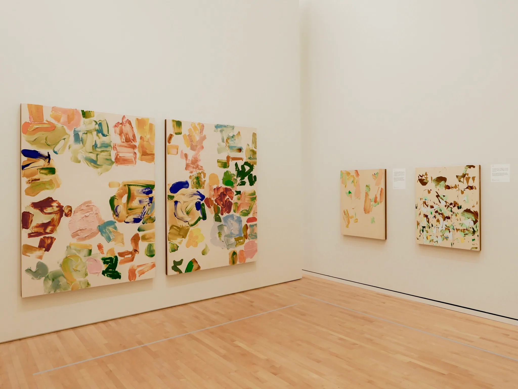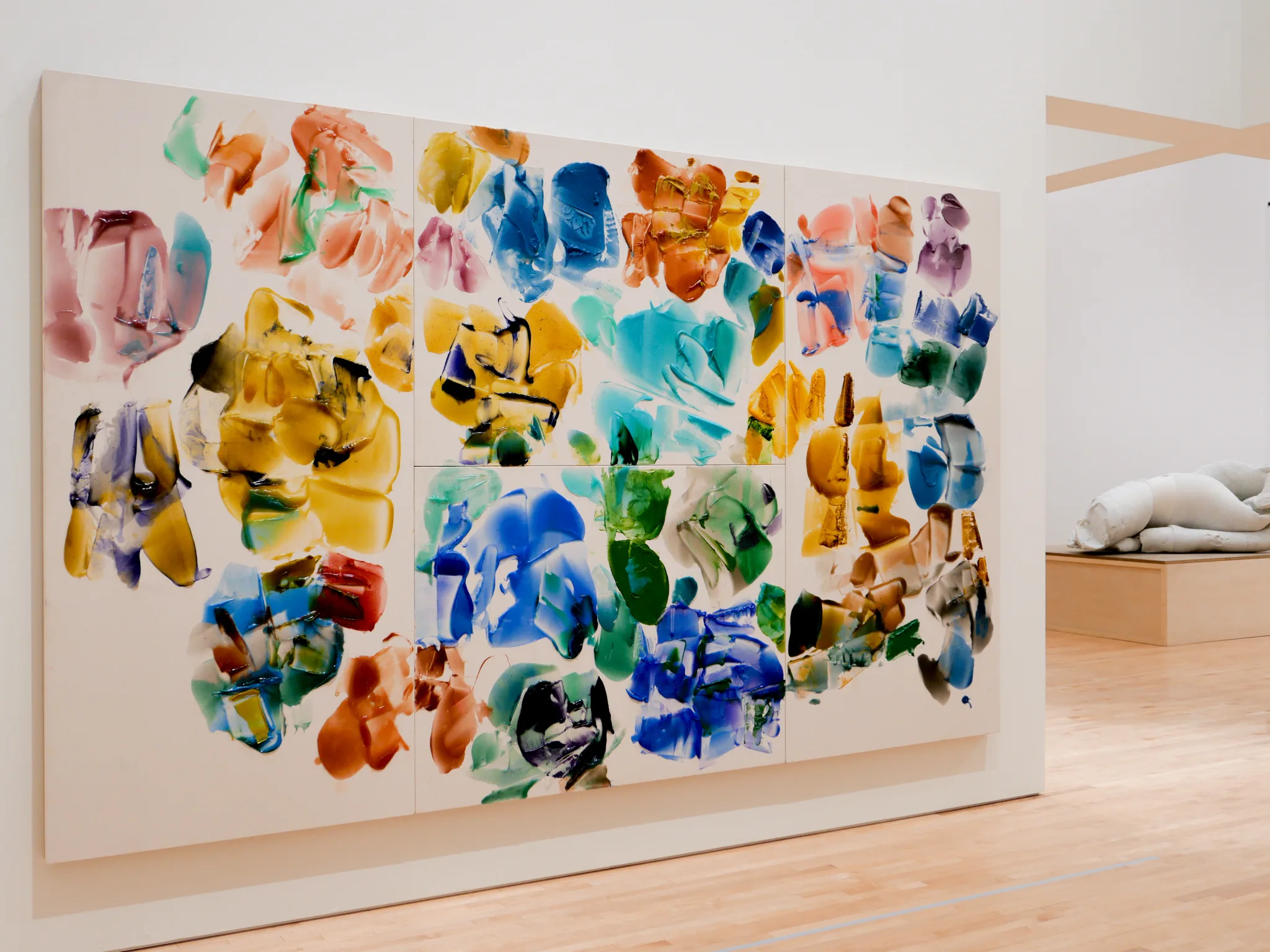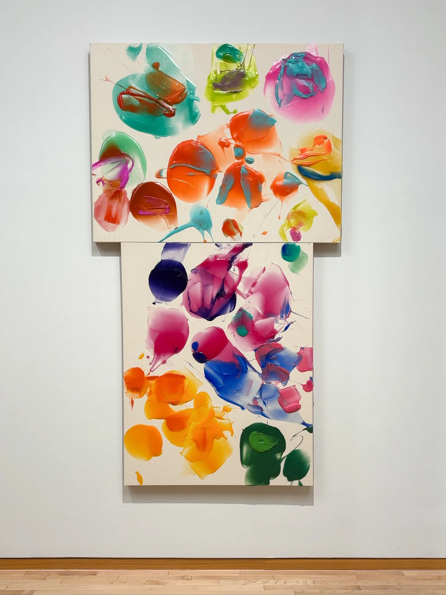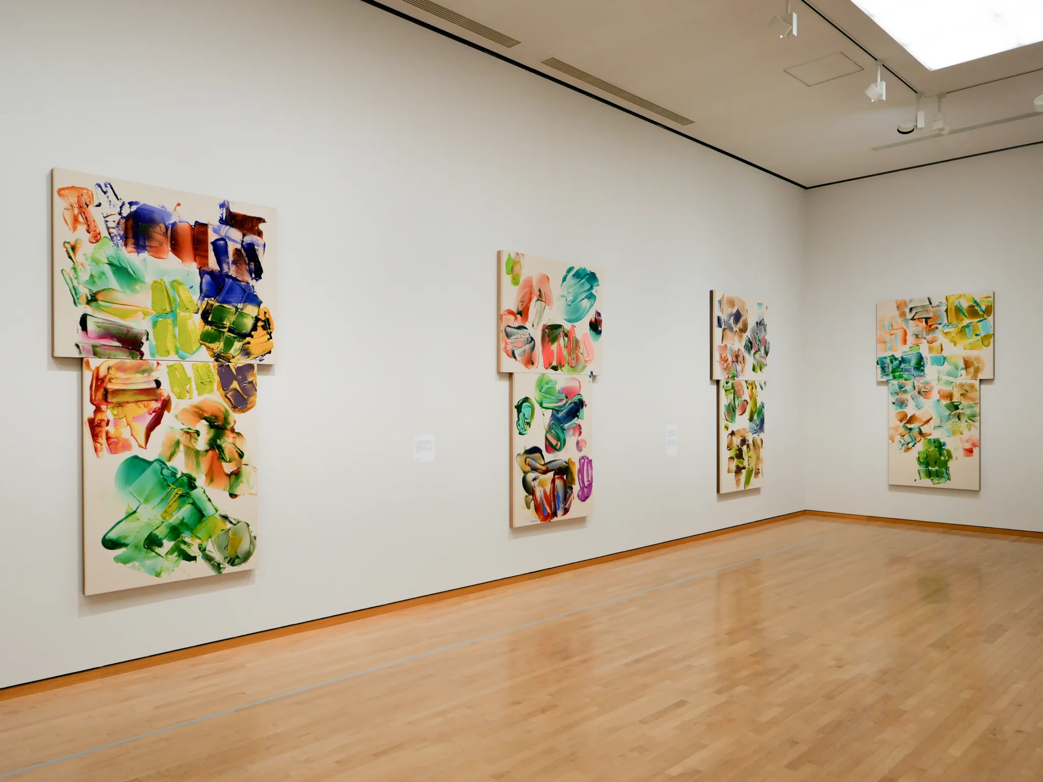 3階会場の冒頭では、「転回」後の岡﨑が制作した大型の絵画作品を一挙に見ることができる。まず気づいたのは、以前から行っていた複数パネルの組み合わせがT字型が多くなり、長文のキャプションは英語の文章が増えたこと。画面はより厚塗りに変化し、配色の明度や特徴のゼリーのように艶がある質感が増している。色彩のブロックは弾けたように大らかになり、作家が得た新境地を感じさせる。