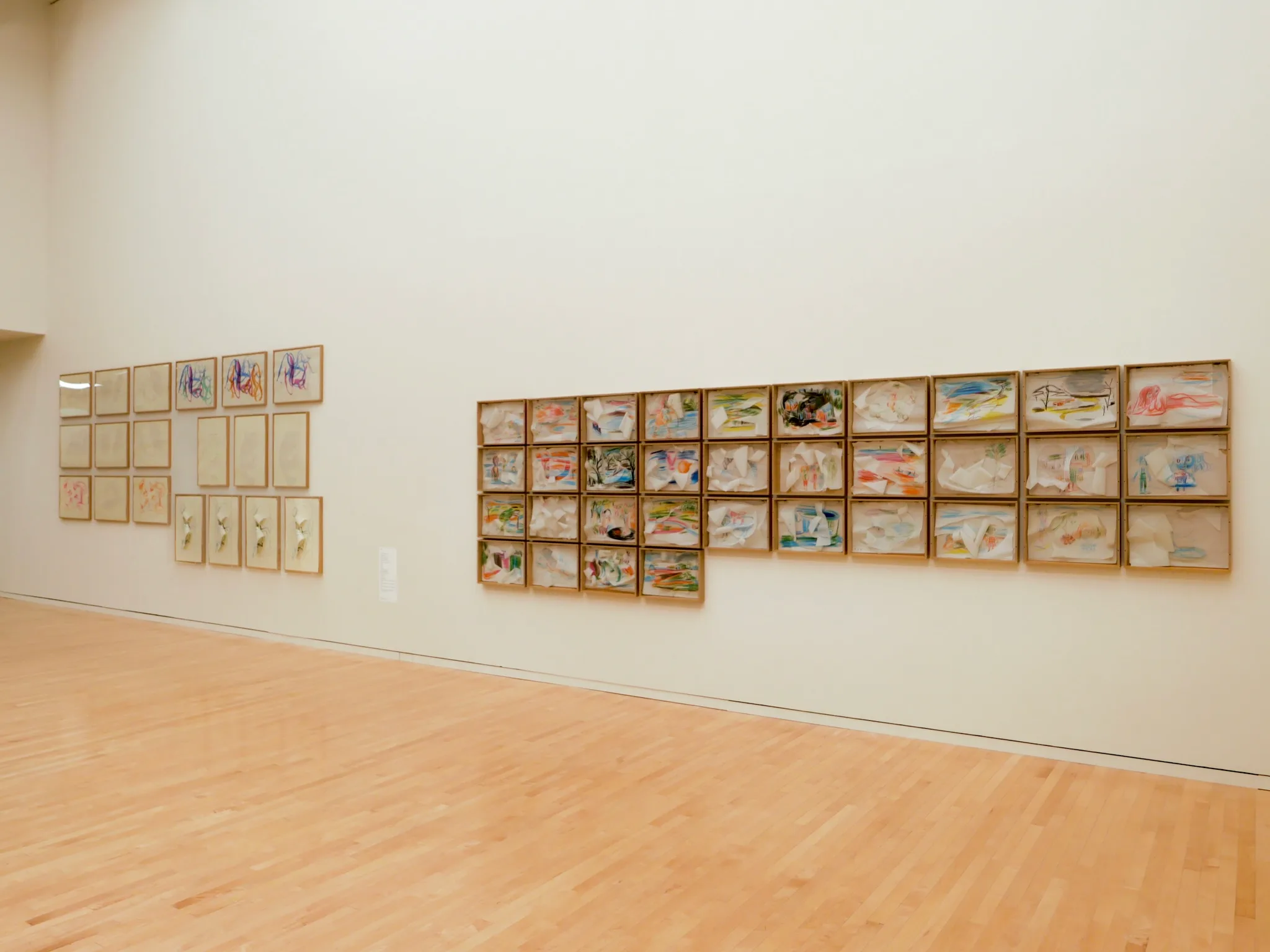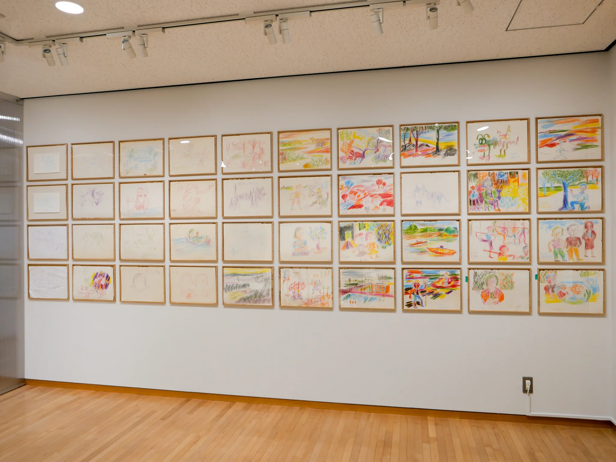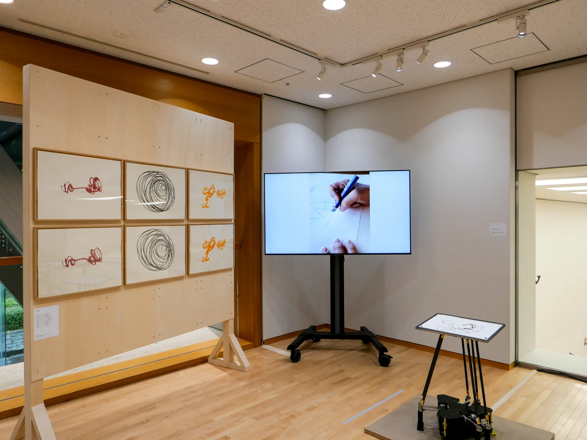 中2階では、岡崎が入院後まもなく描き始めた絵のほか、10年ほど前に開発したドローイング・ロボットに注目したい。他者の描画プロセスがプログラミングされ、体験者はペンを制止させたまま、画家の線の動きを体感できる装置だ。現在の生成AI時代に先駆けて、作る主体の可変性を示した予兆的な作品とも言える。
