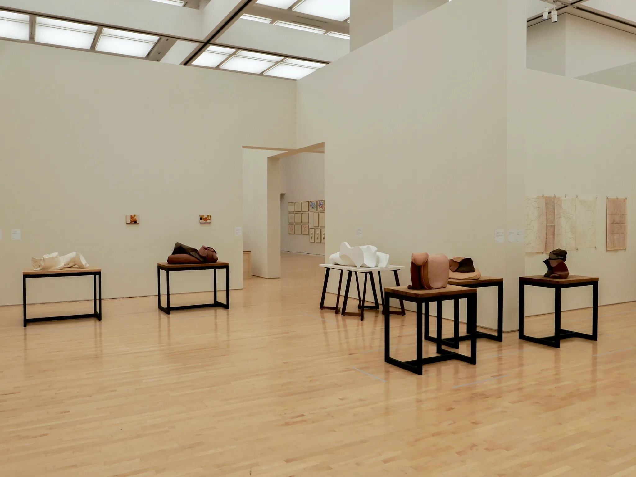 最初の展示室には、最初期の工作物《こづくえ》や洋服の型紙から抽出したラインに基づく平面作品も並ぶ。紙で作られた《こづくえ》は、「あかさかみつけ」を発案する起点になったもので、今回が初公開。ほかにない固有のかたちを追求してきた岡﨑の創造の「原点」がうかがえて必見だ。