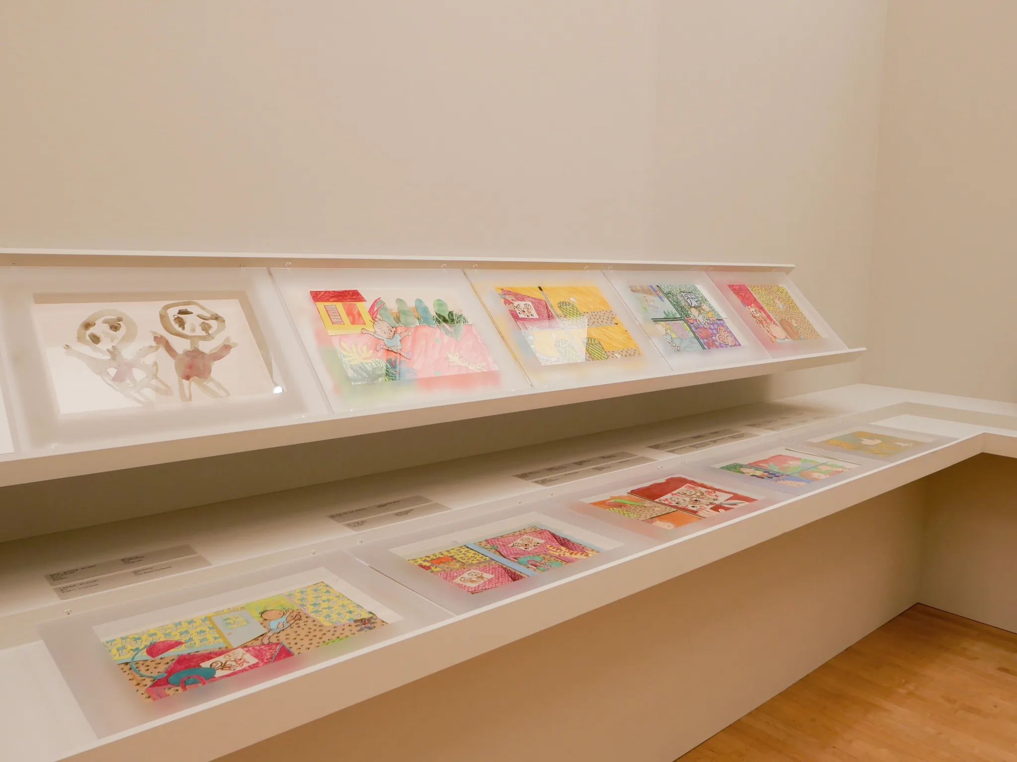 初公開の子供のための百科事典の原画は、詩人の谷川俊太郎の依頼を受けて、当時26歳だった岡﨑が「美術の核心」を表わした。自身の分身のような男の子が外へ飛び出し、好奇心の赴くままに世界を発見していく様子が描かれている。