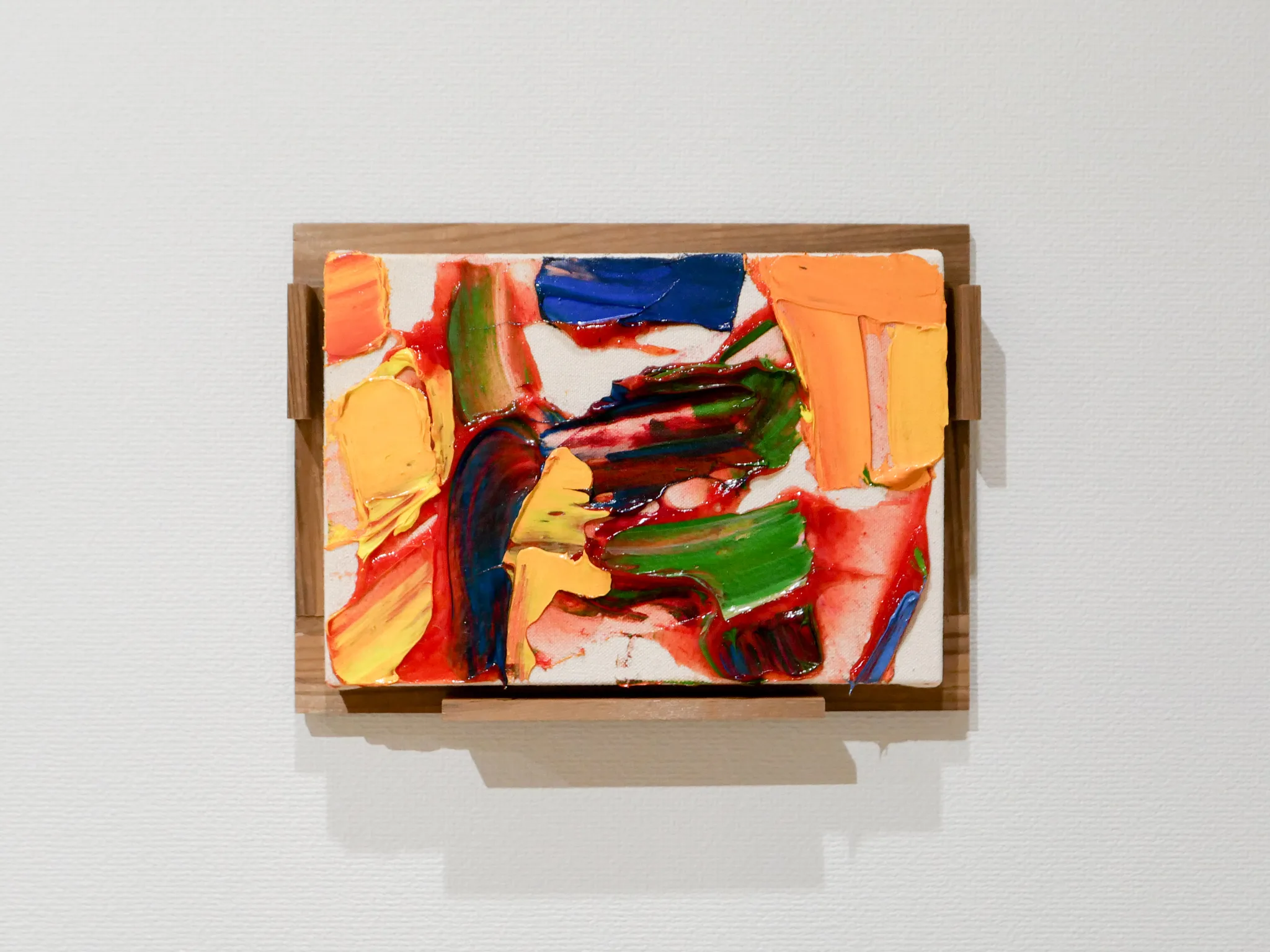 アクリル絵具による絵画制作は1992年以降に本格化した。色とりどりのタッチが踊るような作品は、即興的なようで、じつは岡﨑が作り上げたルールを基に描かれている。よく見るとモチーフの類似や反復、方向転換、色彩の変調などが分かり、瞬きや視点を動かすと見え方がまた変わる。目の快楽のみならず、鑑賞者の認識に働きかけ、能動的に見ることを促す仕掛けを内包しているのだ。