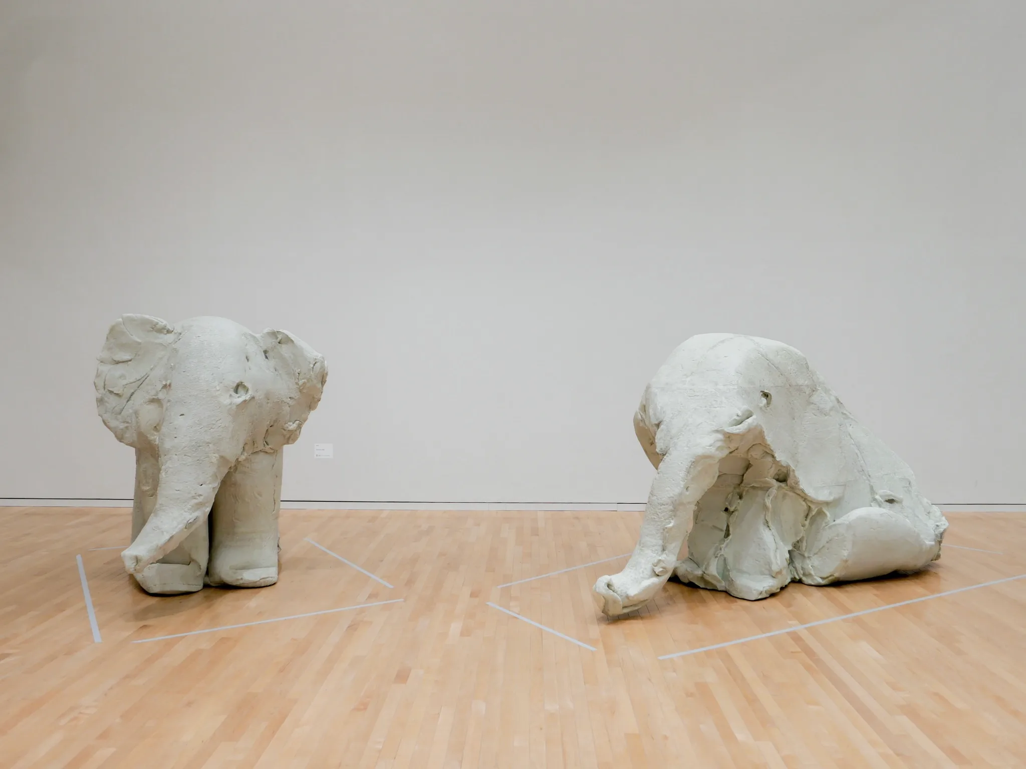 抽象のみならず、大型の具象作品も一角に並ぶ。ゾウをかたどった彫刻群は、「そもそも巨大なゾウの全体像を掴めるのか?」と疑問に思った岡﨑が、実際に観察して制作した。それぞれ異なる姿態を持ち、見る者の童心を呼び覚ますような動きのある瑞々しい造形が印象的だ。